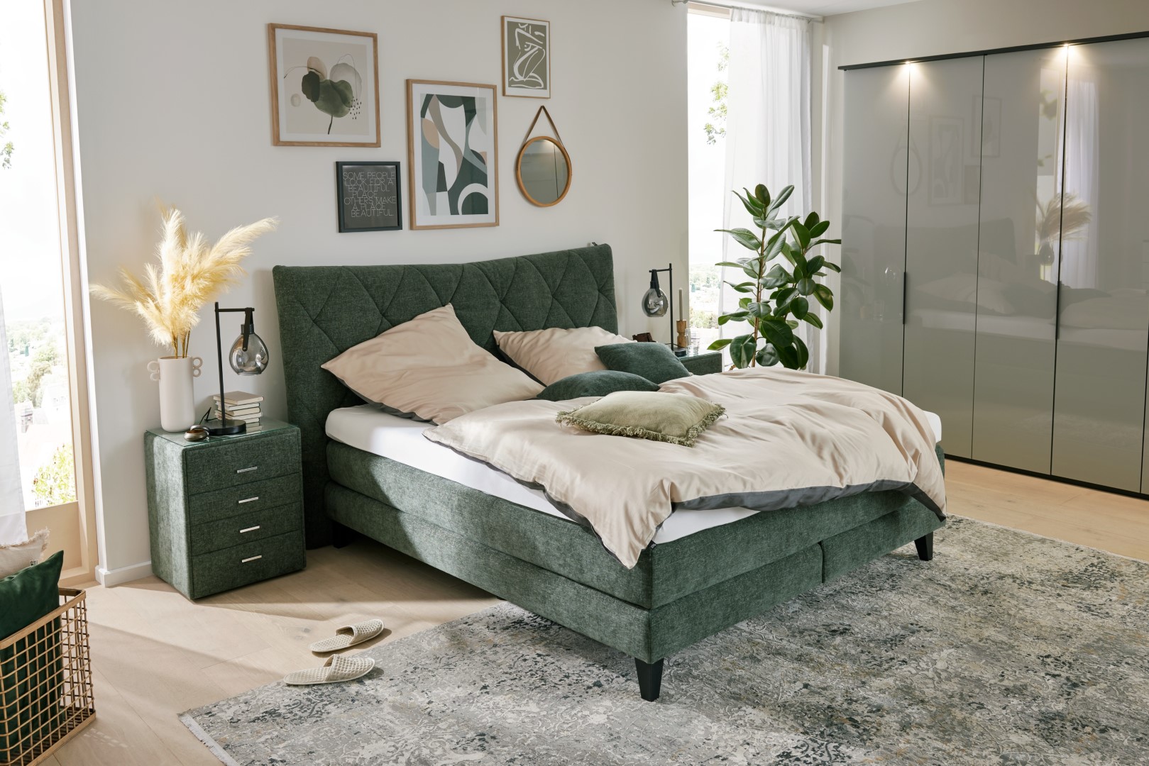 Entdecke das stilvolle Interliving Boxspringbett in einem eleganten Grün, das deinem Schlafzimmer einen Hauch von Frische verleiht. Dieses Bett kombiniert modernen Komfort mit zeitlosem Design und bietet dir ein unvergleichliches Schlaferlebnis. Die hochwertige Verarbeitung und die sorgfältig ausgewählten Materialien sorgen für Stabilität und Langlebigkeit. Genieße erholsame Nächte und wache erfrischt auf, während du dich in das luxuriöse Gefühl von hochwertigem Boxspringkomfort hüllst. Erlebe den Unterschied, den ein sorgfältig gestaltetes Bett für dein Wohlbefinden und deinen Schlaf machen kann. Mache dein Schlafzimmer zu einer Oase der Ruhe und des Stils mit diesem eindrucksvollen Highlight.