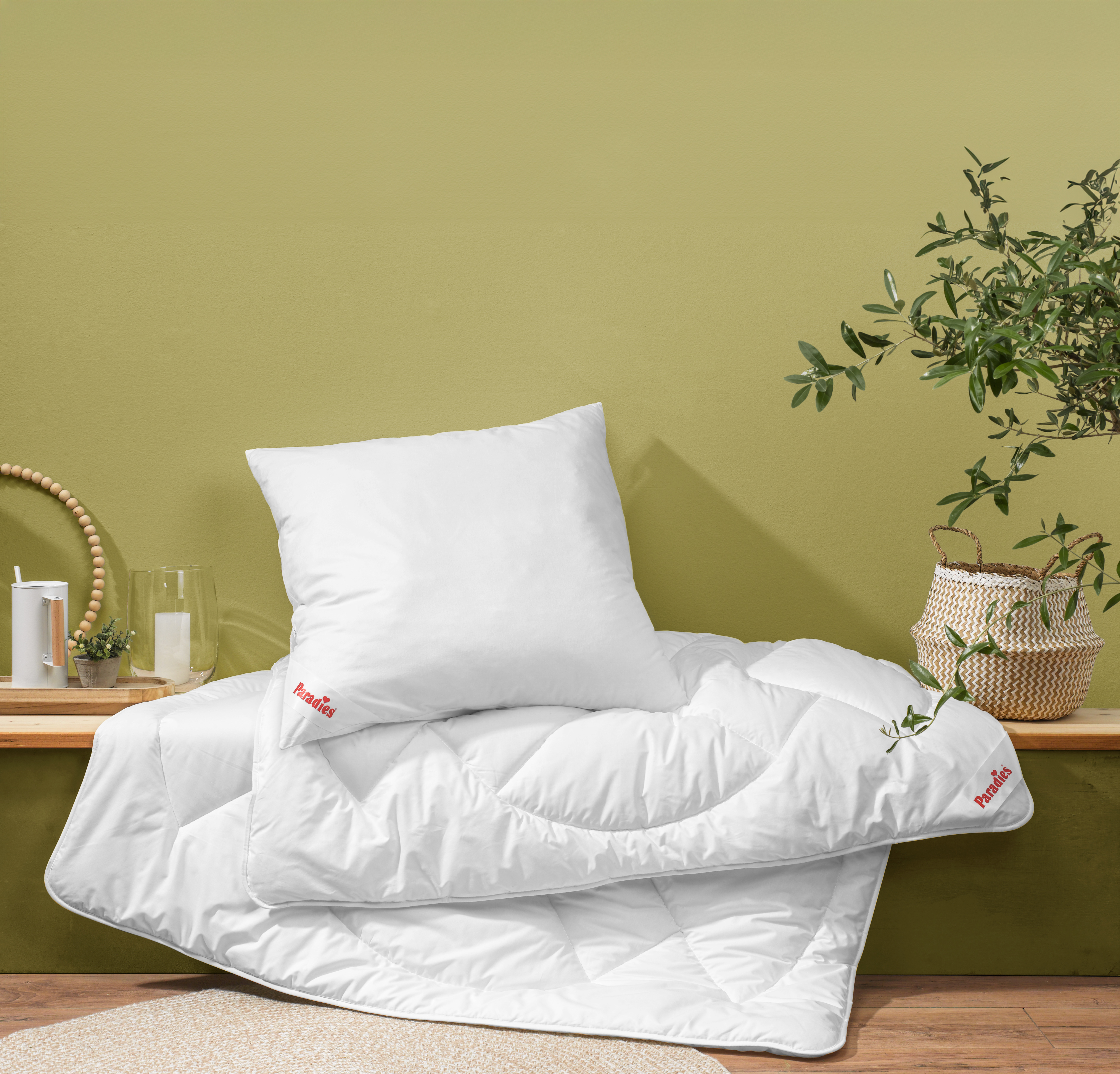 Das Betten-Set Bio besteht aus einer Ganzjahresbettdecke (135x200 cm) und einem Kopfkissen (60x80 cm). Die Bettdecke ist mit der Textilfaserfüllung PARADIES Fill gefüllt, die ein dauerhaft hohes, kuscheliges Volumen garantiert. Die Textilfaserfüllung ist der Umwelt zuliebe 50 % recycelt (GRS-zertifiziert). Das PARADIES Greentex BIO-Baumwollgewebe ist mit Aloe Vera veredelt und fühlt sich schön weich an. Das Kopfkissen stützt Kopf und Nacken angenehm ab. Die Füllung aus PARADIES Softys ist pflegeleicht und dauerhaft bauschig. Der Bezug besteht ebenfalls aus PARADIES Greentex BIO-Baumwollgewebe mit Aloe Vera-Gewebeveredelung. Das Kissen ist mit einem Reißverschluss ausgestattet, so dass die Füllmenge individuell angepasst werden kann. Die eingesetzten Gewebe sind ohne optische Aufheller.