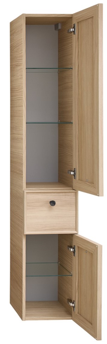 Der Farbton Eiche sorgt bei dem Solitaire 7300 Hochschrank für eine warme und einladende Atmosphäre. Mit seiner hochwertigen Eiche Tropea Nachbildung beeindruckt er durch eine authentische Holzoptik. Die transparente Teilaspekte verleihen dem Design eine moderne Note, die sich perfekt in jedes Raumkonzept einfügt. Ideal für dein Zuhause, bietet der Hochschrank nicht nur stilvolles Design, sondern auch praktischen Stauraum. Ob im Badezimmer oder in anderen Wohnbereichen, dieser Schrank überzeugt durch Funktionalität und Eleganz. Entdecke, wie der Solitaire 7300 Hochschrank deinem Raum das gewisse Etwas verleiht.