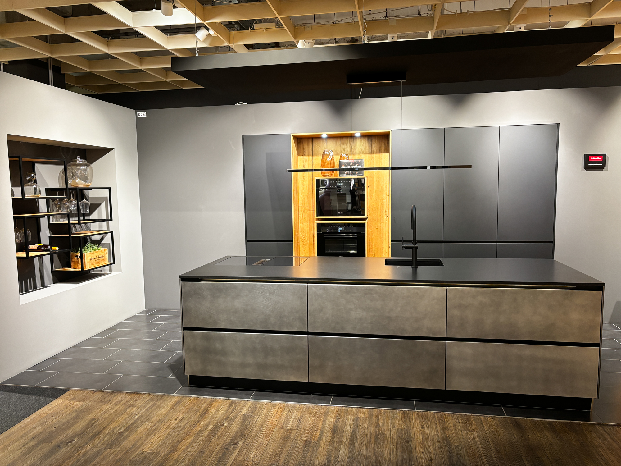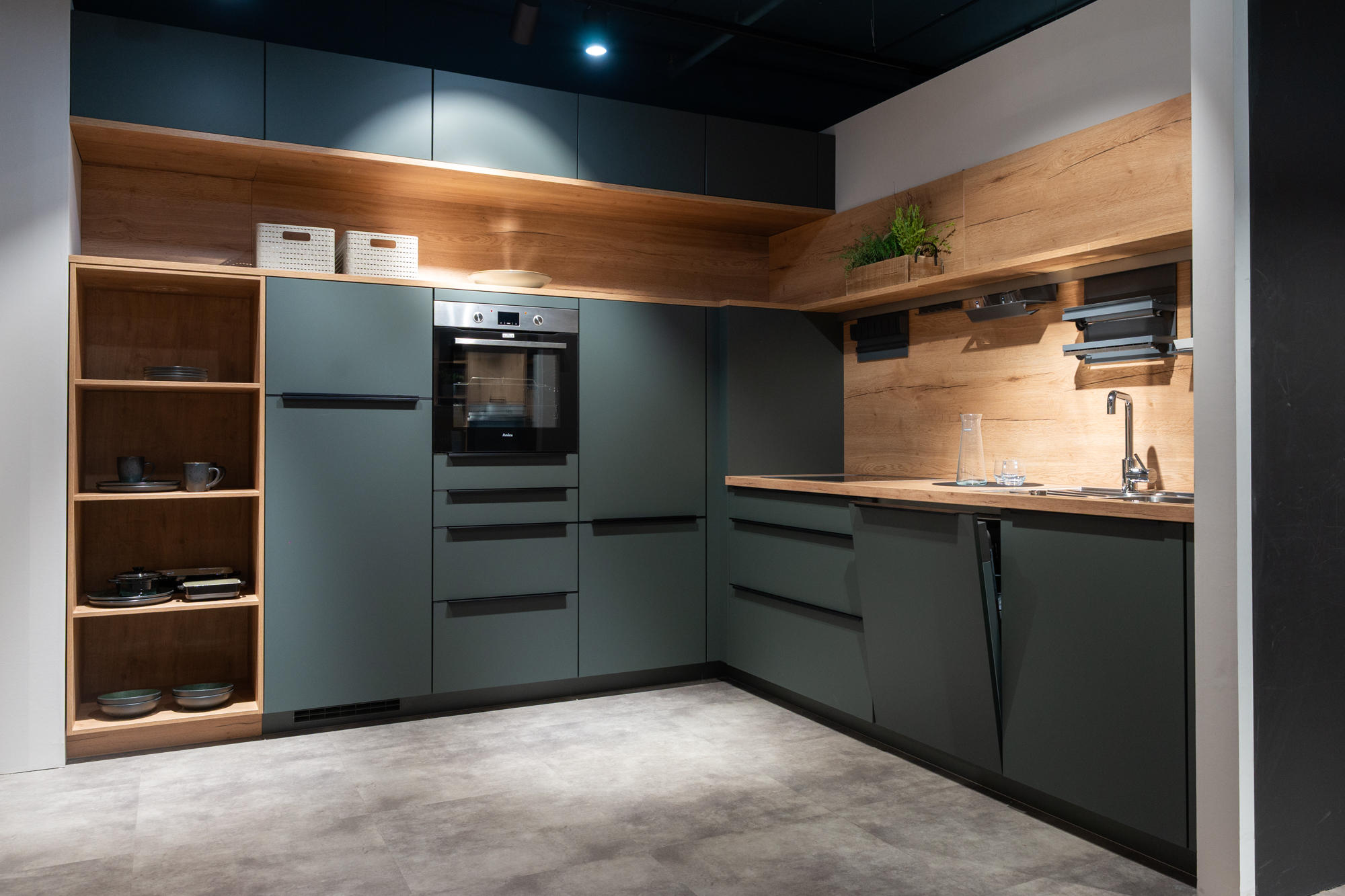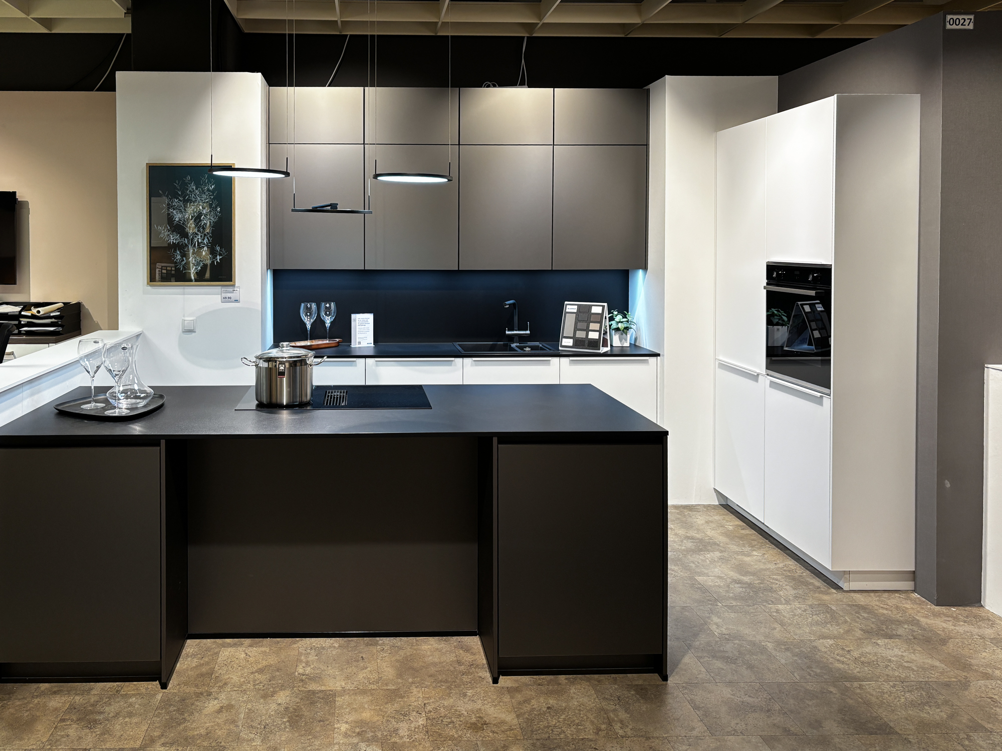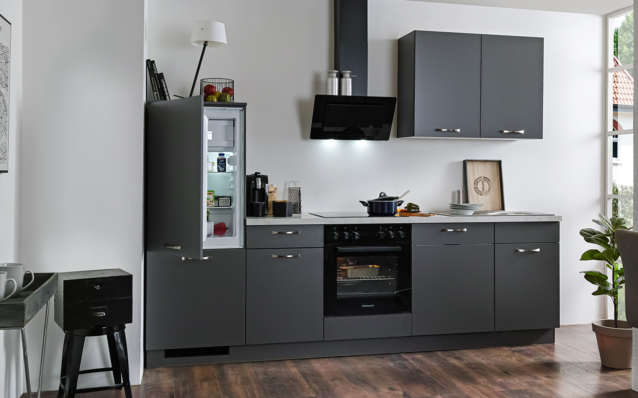 Front UV-Lack schwarz supermatt, Korpus anthrazit, Arbeitsplatte Steinstruktur schwarz. Ausgestattet mit hochwertigen Elektrogeräten und Einbauspüle. Maße 315+274 cm. Ohne Deko.