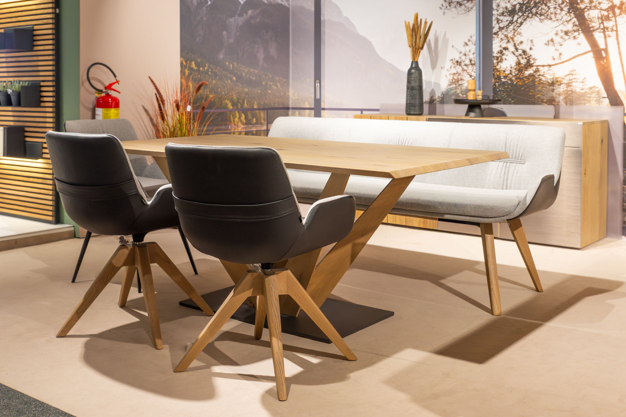 Tischgruppe V-Galvino, Tisch ca. 180x100 cm in Alteiche rustico/lackiert, Sitzbank/Stühle in Bezug Leder schwarz, Gestell in Holz drehbar/Metall schwarz