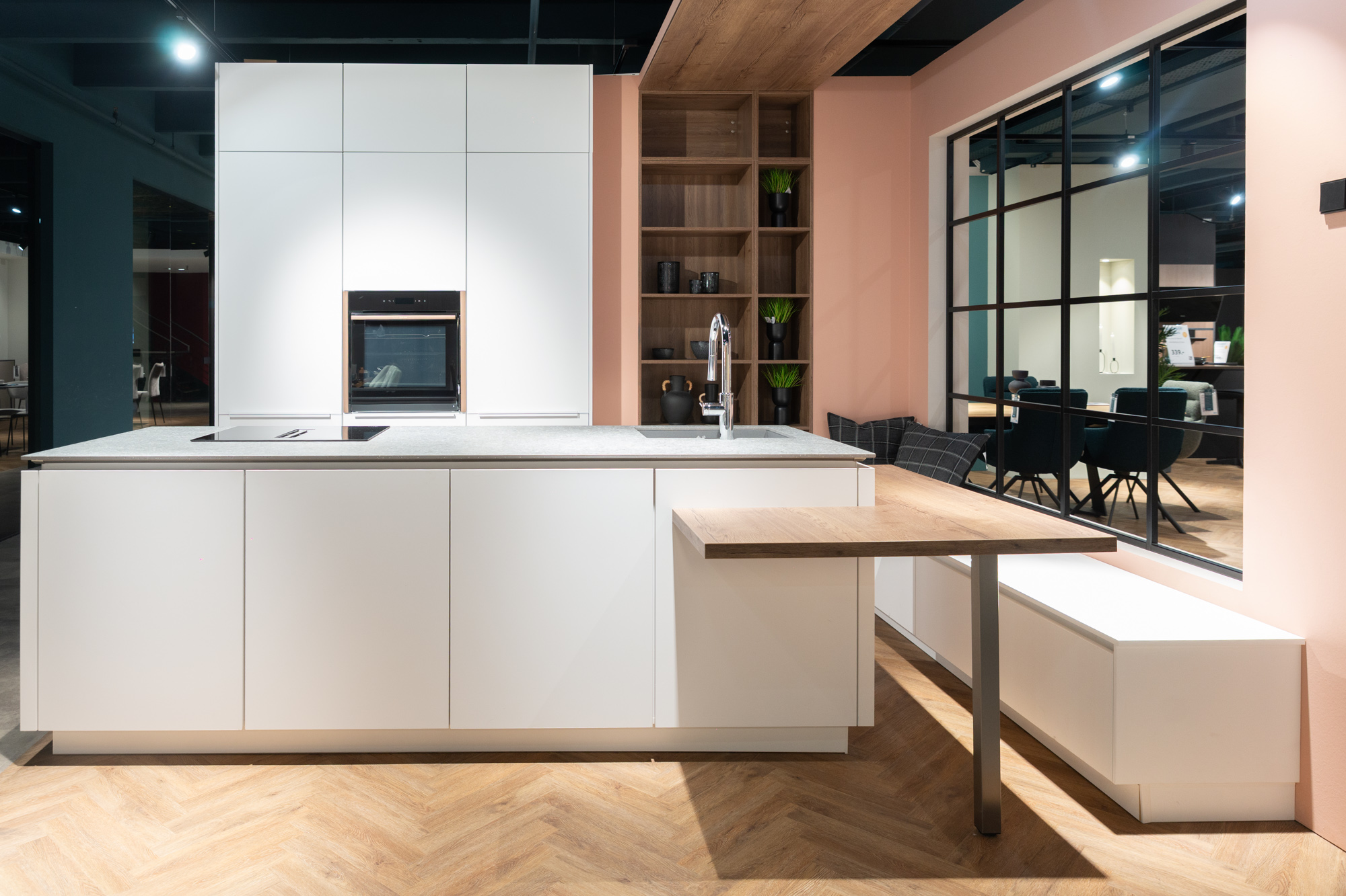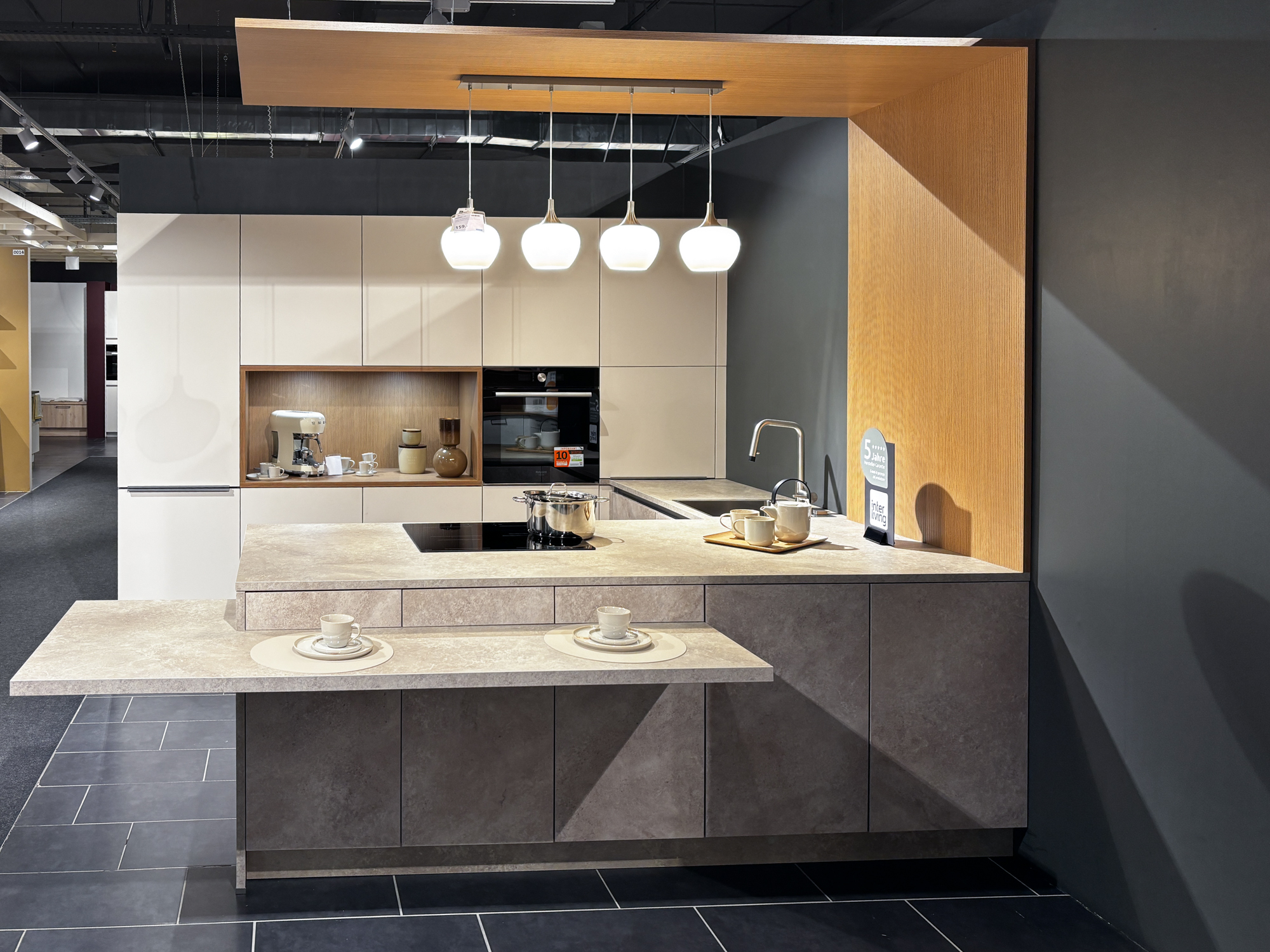 Front Lacklamitnat sand ultramatt mit Anti-Fingerprint-Beschichtung, Korpus sand, Arbeitsplatten Granit schwarz geflammt Nachbildung, Nischenverkleidung im Dekor Stripewood light. Mit hochwertigen Elektrogeräten und Einbauspüle, Maße ca. 350x240x185 cm. Ohne Deko.
