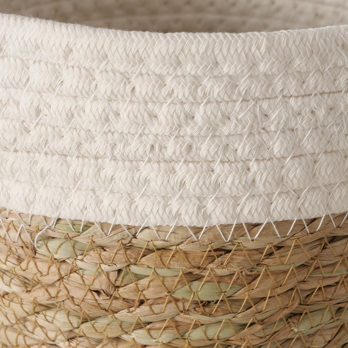 Ein auffälliger runder Charme umgibt das Modell Nila, das in den betörenden Farbtönen Cremeweiß und Natur erhältlich ist. Dieser Korb vereint geschickt die natürliche Robustheit von Seegras mit der Weichheit von Baumwolle und der Langlebigkeit von Polyester. Mit einem Durchmesser von 20 cm ist er die ideale Wahl, um Ordnung und Stil in dein Zuhause zu bringen. Egal, ob als dekoratives Element oder als praktischer Aufbewahrungshelfer, dieser Korb passt sich deiner Umgebung perfekt an. Lasse dich von seinem natürlichen Charisma inspirieren und finde den idealen Platz für dieses zeitlose Accessoire.