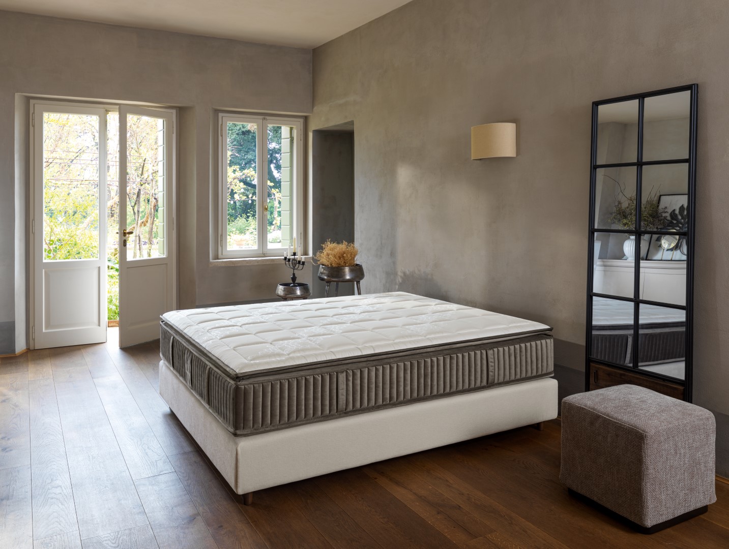 Victoria ist mit 1.000 unabhängigen Federn (Ø ca. 5,7 cm) ausgestattet, die in 7 ergonomischen Zonen mit differenzierter Festigkeit angeordnet sind – für eine ausgewogene Gewichtsverteilung und eine progressive Unterstützung. Der Komfort der Struktur wird durch eine obere Schicht aus Fresh Memory erhöht, die den Körper sanft aufnimmt und zur Entspannung beiträgt. Darunter befindet sich ein profilierter Kern aus EcoLympha, der für eine gezieltere und reaktionsfreudigere Stützwirkung sorgt. Der verstärkte Boxspring-Rahmen entlang des gesamten Umfangs gewährleistet Stabilität und optimalen Halt.