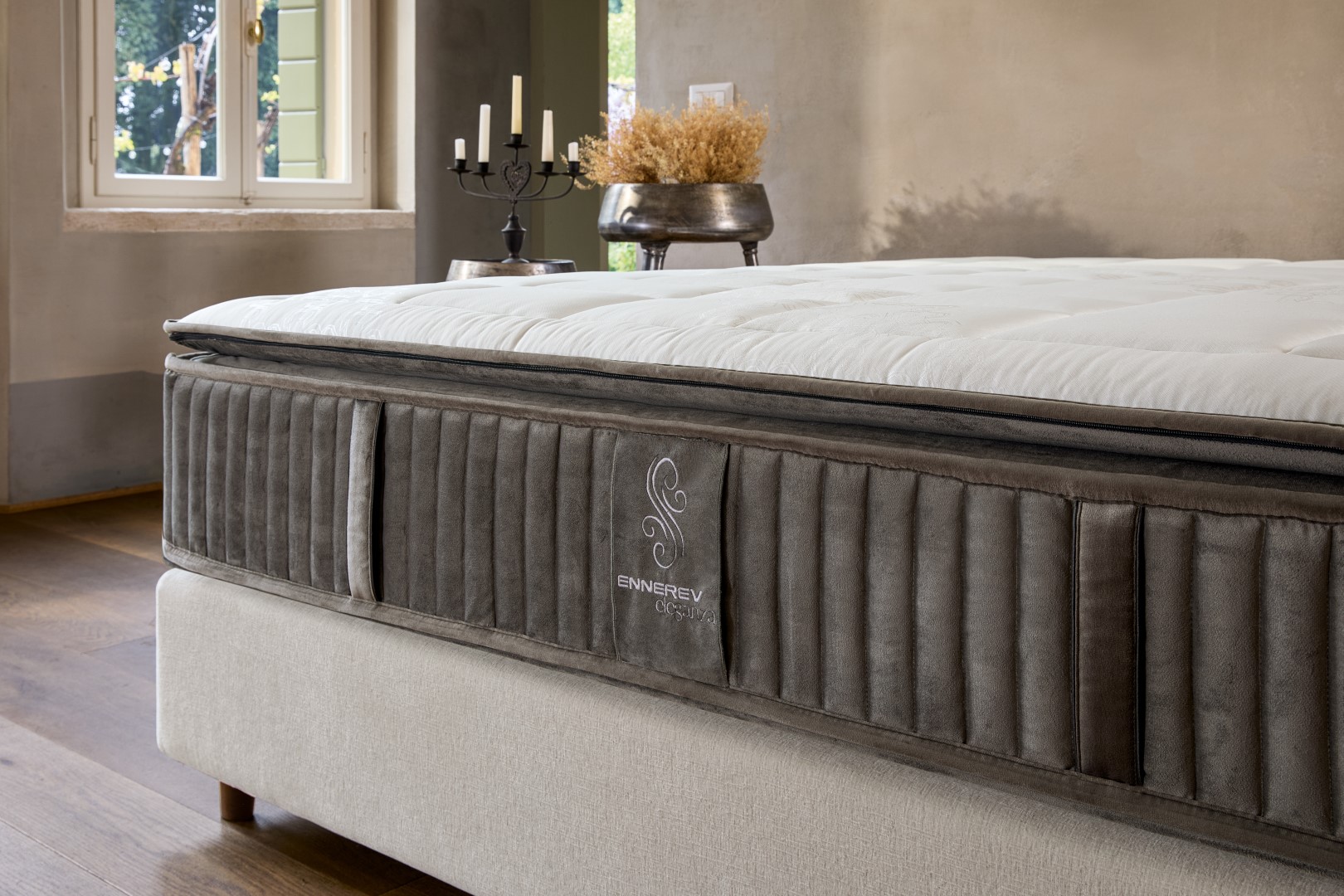 Victoria ist mit 1.000 unabhängigen Federn (Ø ca. 5,7 cm) ausgestattet, die in 7 ergonomischen Zonen mit differenzierter Festigkeit angeordnet sind – für eine ausgewogene Gewichtsverteilung und eine progressive Unterstützung. Der Komfort der Struktur wird durch eine obere Schicht aus Fresh Memory erhöht, die den Körper sanft aufnimmt und zur Entspannung beiträgt. Darunter befindet sich ein profilierter Kern aus EcoLympha, der für eine gezieltere und reaktionsfreudigere Stützwirkung sorgt. Der verstärkte Boxspring-Rahmen entlang des gesamten Umfangs gewährleistet Stabilität und optimalen Halt.