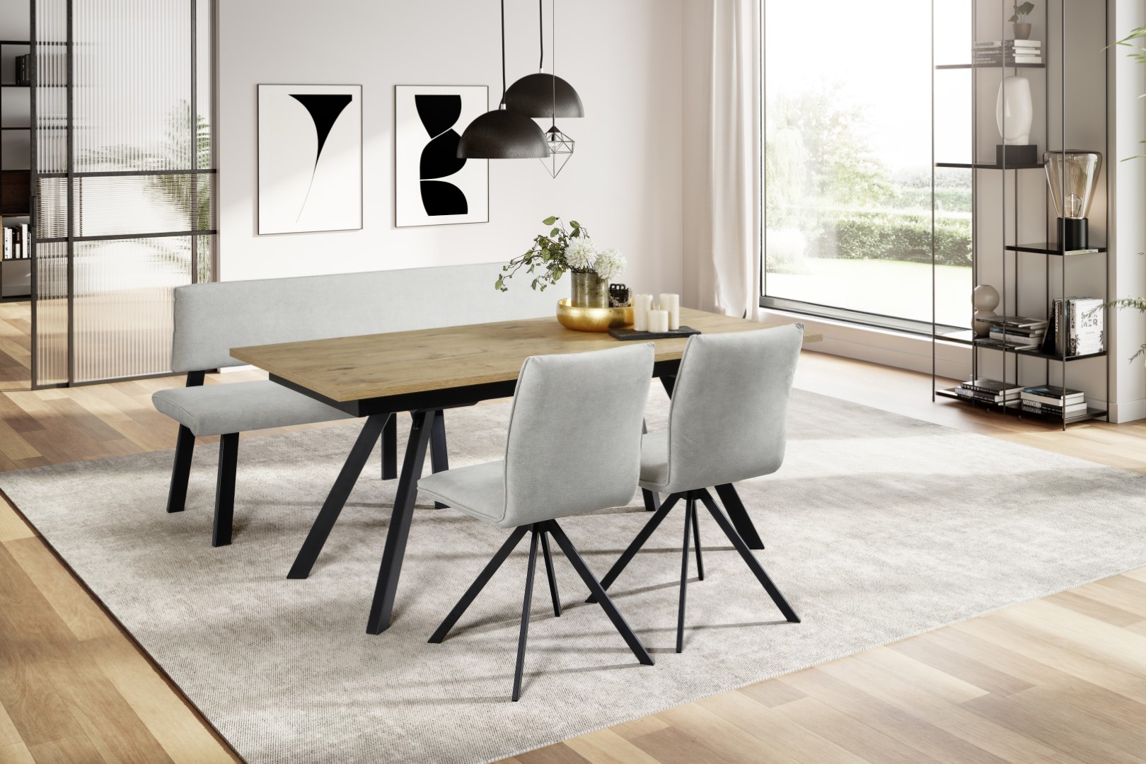 Ein elegantes Zusammenspiel von Hellgrau und Eiche definiert die Tischgruppe Malta, perfekt für dein stilvolles Zuhause. Die Tischplatte aus hochwertigem Eiche Casella Dekor strahlt natürliche Wärme aus und wird durch die pulverbeschichteten, schwarzen Metallbeine ergänzt, die für Stabilität und einen modernen Look sorgen. Ob für gesellige Runden oder ruhige Abende, die Tischgruppe bietet dir Komfort und Funktionalität in einem. Der Stoff in Hellgrau verleiht den Stühlen eine zeitlose Eleganz, die sich nahtlos in jedes Wohnambiente einfügt. Lass dich von diesem harmonischen Ensemble inspirieren und schaffe einen Ort der Begegnung und Entspannung.
