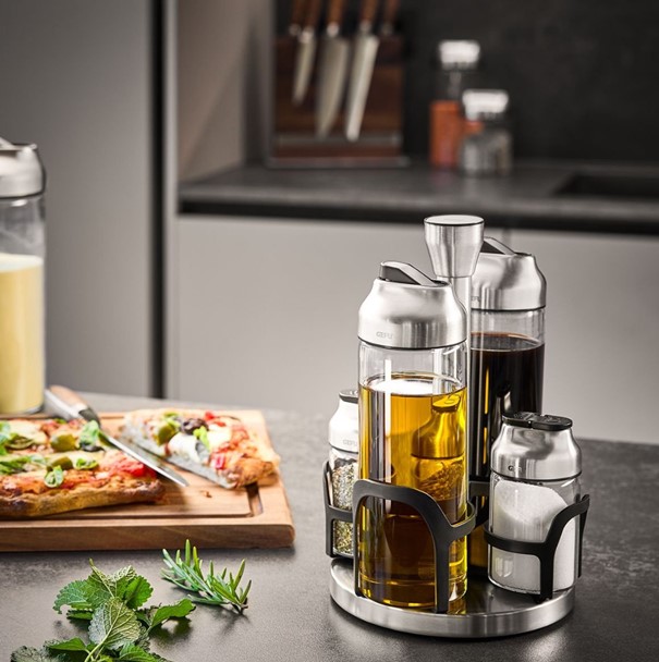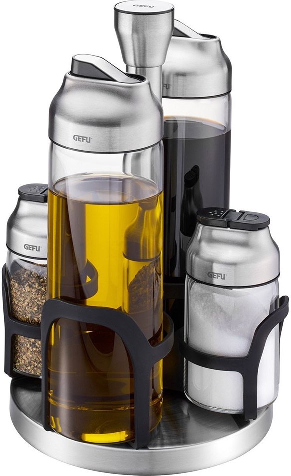 | Bestehend aus: | 2 Essig-/Ölflaschen à 400 ml, 2 Gewürzstreuer à 120 ml, Halterung |