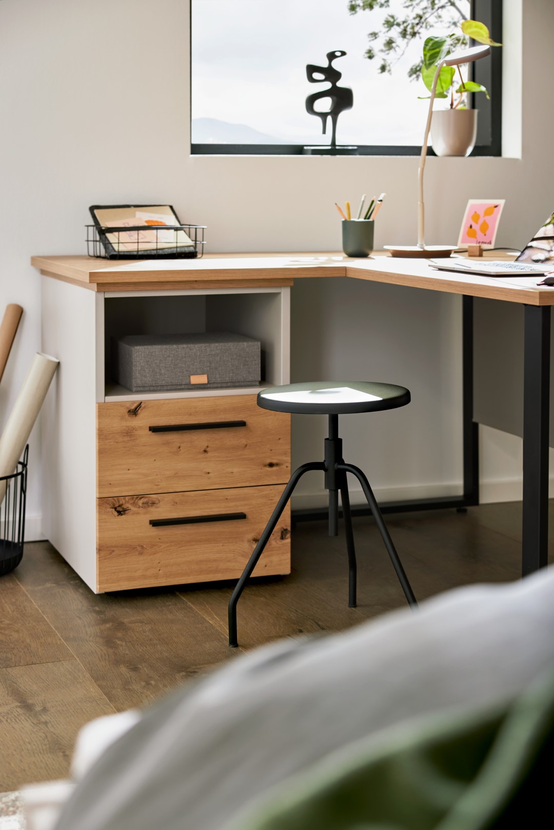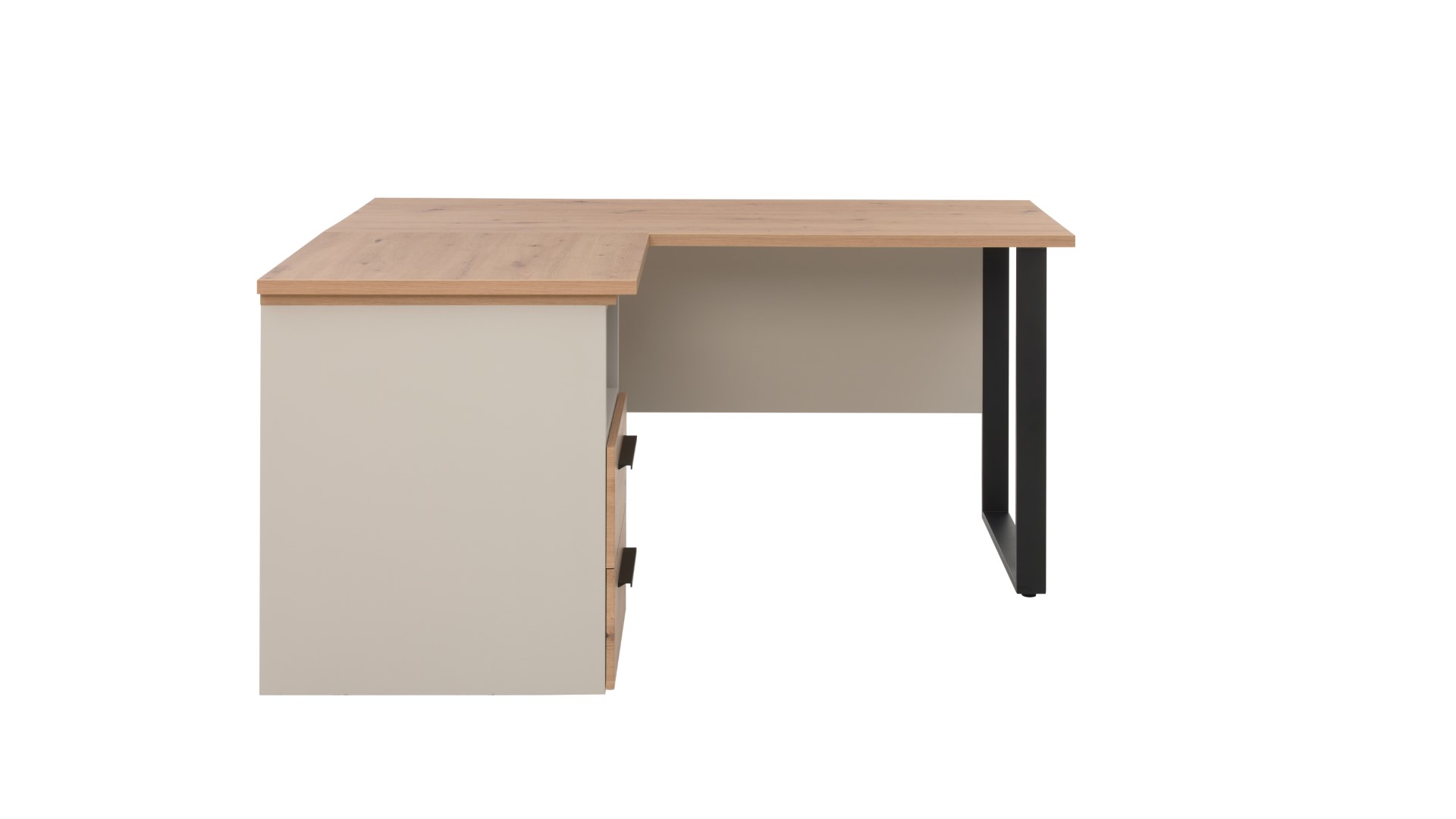 Erlebe die stilvolle Kombination von Eiche Artisan und sandgrauem Farbton mit der Schreibtischkombination Interliving 1702. Die L-Form bietet dir optimalen Platz für produktives Arbeiten, während die matt bearbeiteten Oberflächen für eine edle Optik sorgen. Dank der schwarzen Metallgestellausführung erhält der Schreibtisch einen modernen Touch, der in jedem Büro Akzente setzt. Die harmonische Farbpalette aus Braun und Grau fügt sich nahtlos in verschiedenste Einrichtungsstile ein. Lass deine Kreativität fließen und gestalte deinen Arbeitsbereich mit diesem funktionalen und gleichzeitig ästhetischen Möbelstück neu.