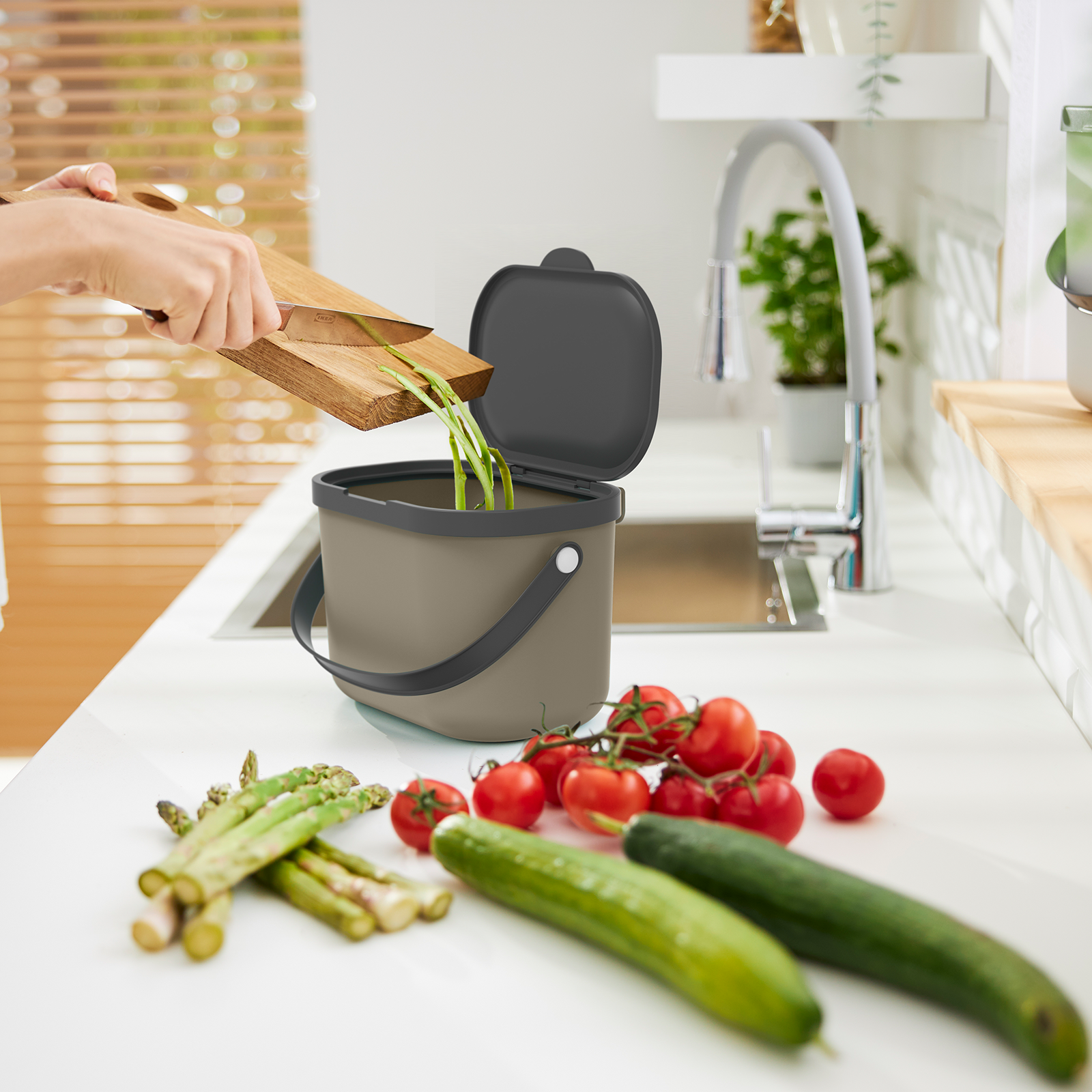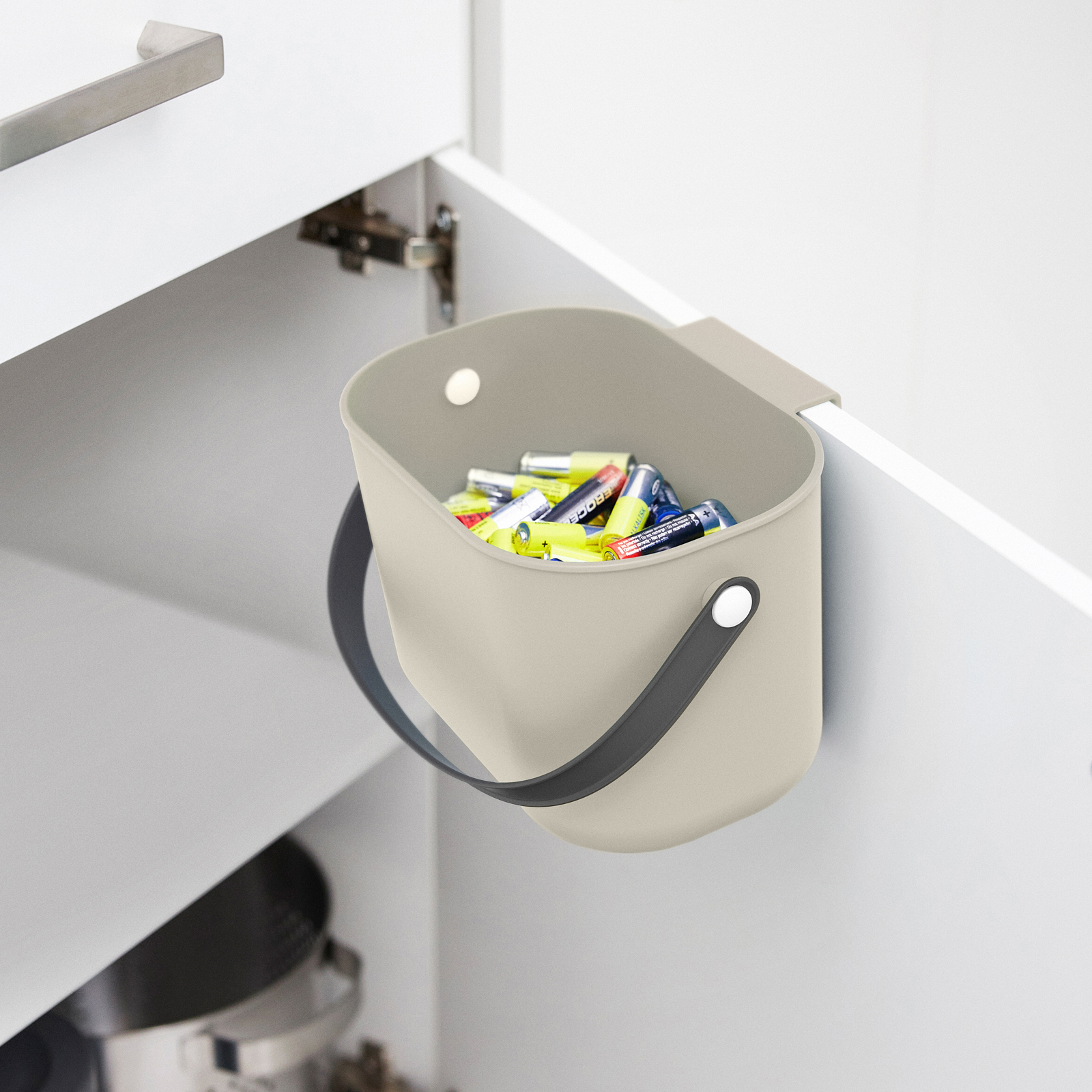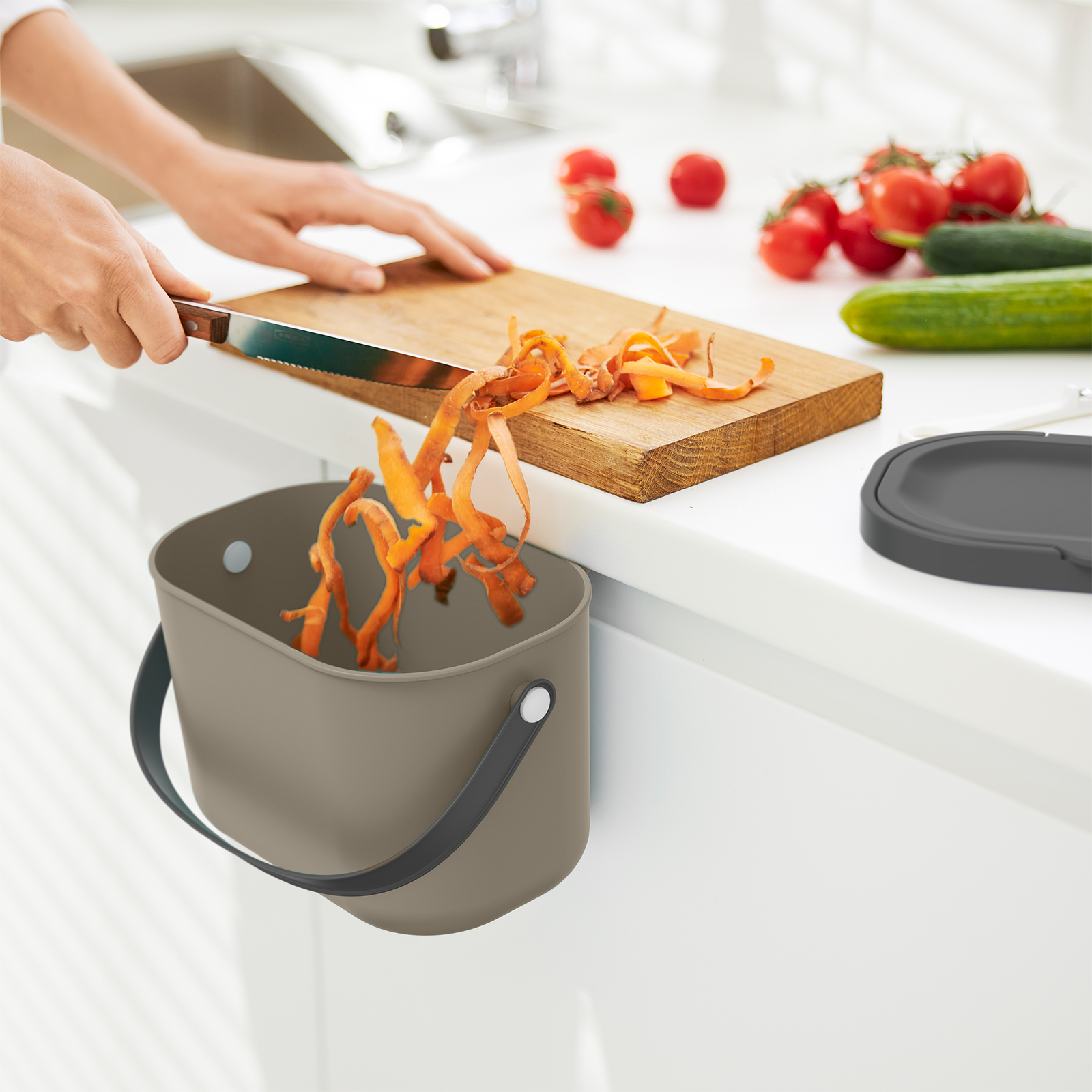 Il nostro sistema di riciclaggio dei rifiuti ALBULA, orientato al design, si arricchisce di un nuovo elemento. Il nuovo bidone da 3,2 litri è perfetto per il piano di lavoro come aiuto in cucina per raccogliere i rifiuti alimentari compostabili in modo pratico e semplice. Grazie alle sue dimensioni compatte, può essere posizionato sul piano di lavoro o appeso ad ante e cassetti della cucina grazie al dispositivo di sospensione integrato. L'ampia apertura consente di smaltire gli avanzi in modo semplice e pulito. Il coperchio rimane in posizione aperta o può essere rimosso completamente, se necessario. La comoda maniglia ne facilita il trasporto, anche quando il contenitore è pieno.