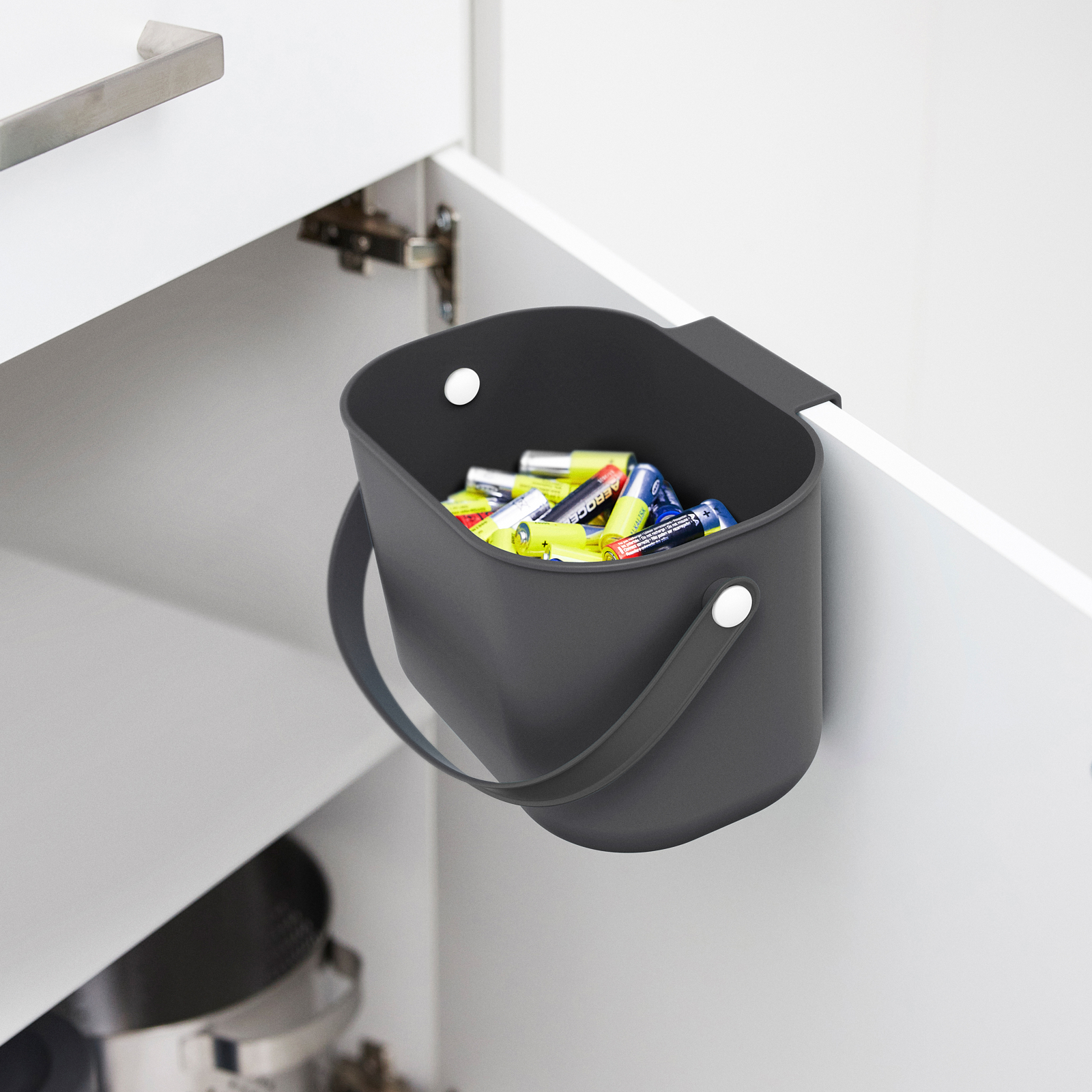 Il nostro sistema di riciclaggio dei rifiuti ALBULA, orientato al design, si arricchisce di un nuovo elemento. Il nuovo contenitore da 3,2 litri è perfetto per il piano di lavoro come aiuto in cucina per raccogliere i rifiuti alimentari compostabili in modo pratico e semplice. Grazie alle sue dimensioni compatte, può essere posizionato sul piano di lavoro o appeso ad ante e cassetti della cucina grazie al dispositivo di sospensione integrato. L'ampia apertura consente di smaltire gli avanzi in modo semplice e pulito. Il coperchio rimane in posizione aperta o può essere rimosso completamente, se necessario. La comoda maniglia ne facilita il trasporto, anche quando il contenitore è pieno.