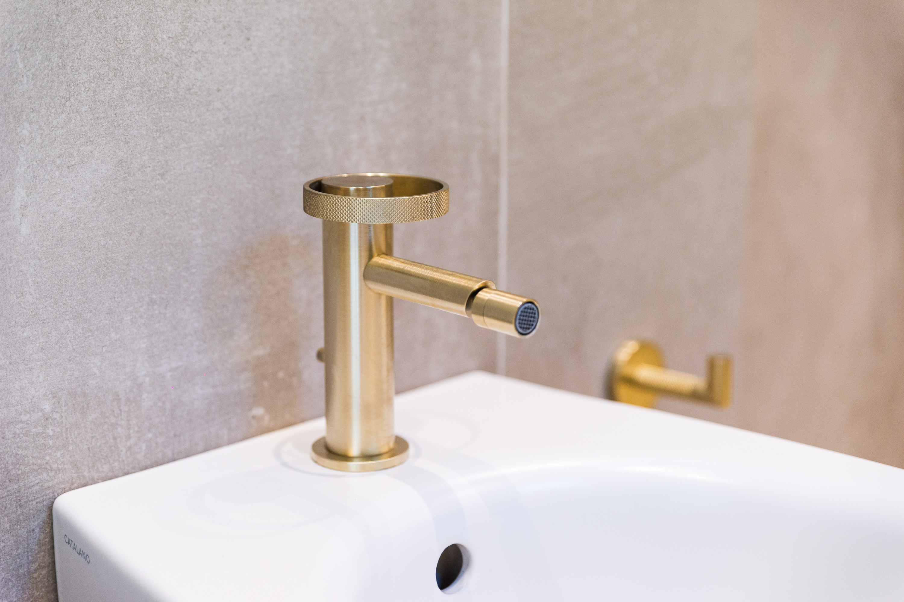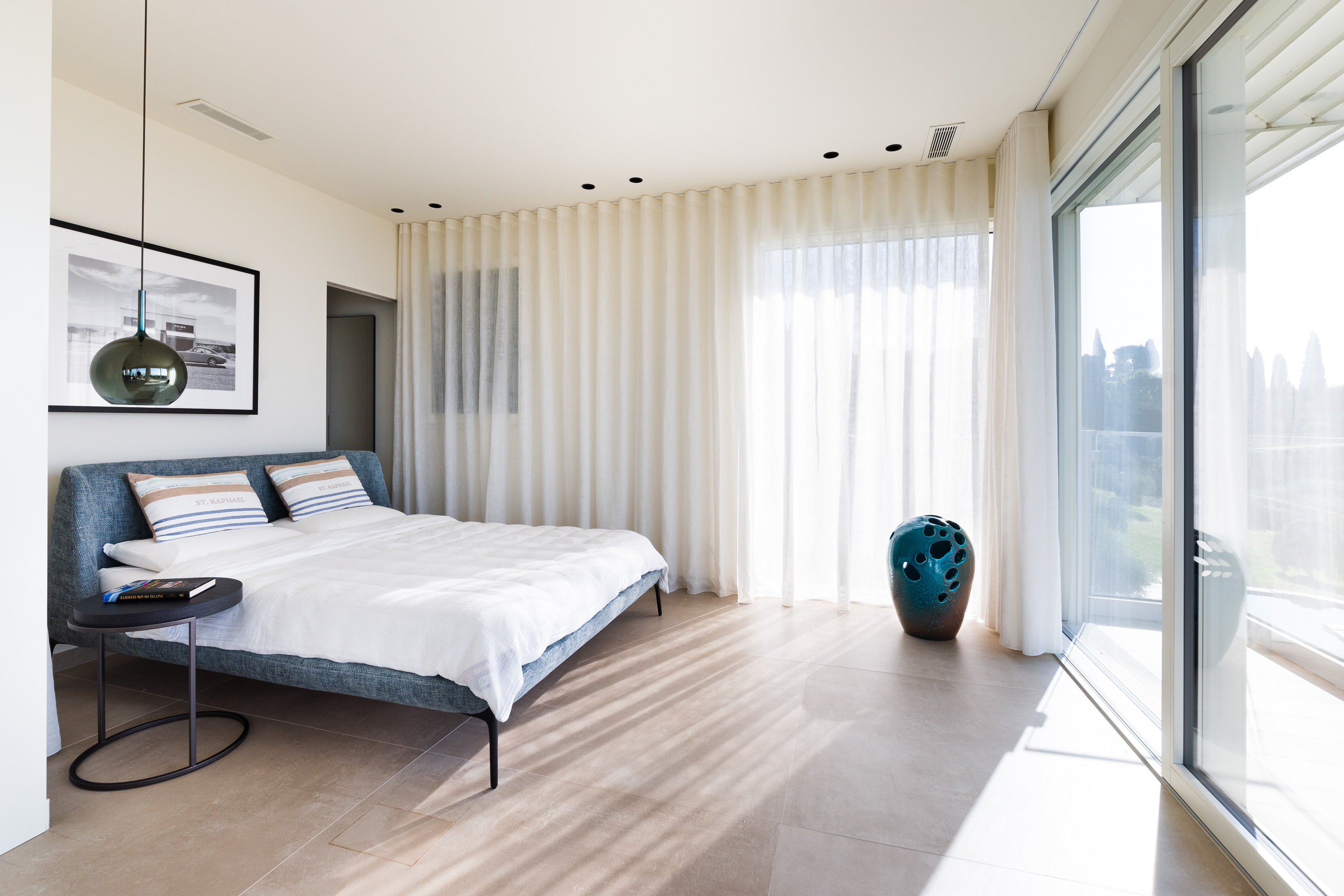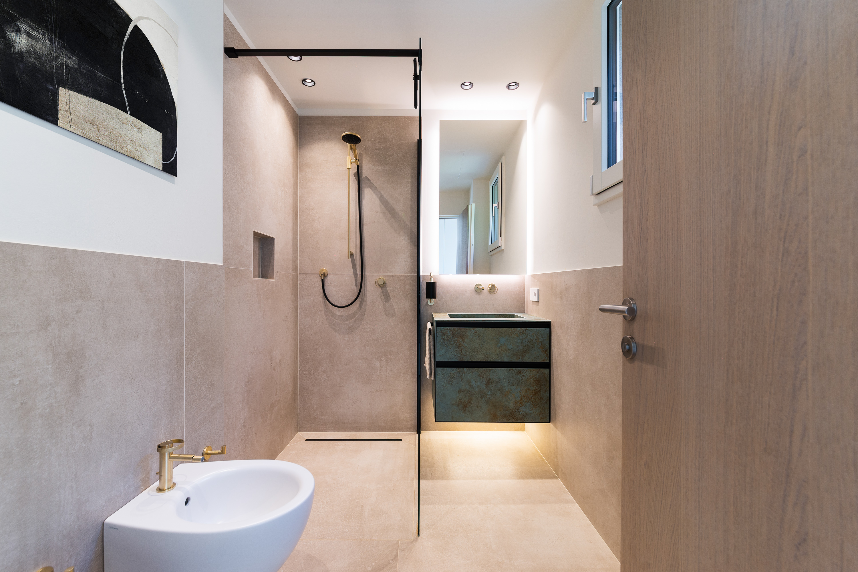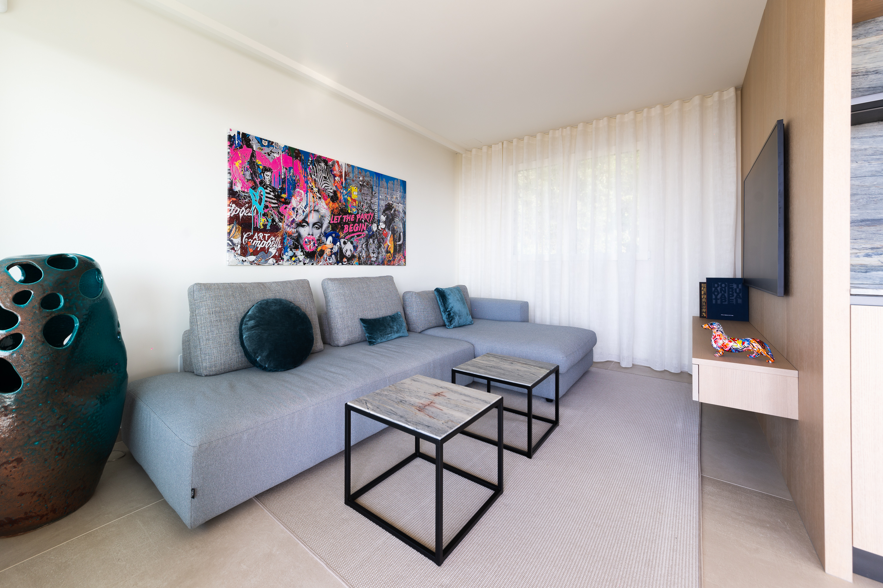 Divani e poltrone moderni di Novamobili e Ditre Italia donano un'atmosfera accogliente al soggiorno. Le leggere tende a onda garantiscono privacy, mentre elementi decorativi e lampade a sospensione completano l’ambiente con stile. Nel bagno, eleganti rubinetterie dorate di Gessi aggiungono un tocco raffinato.