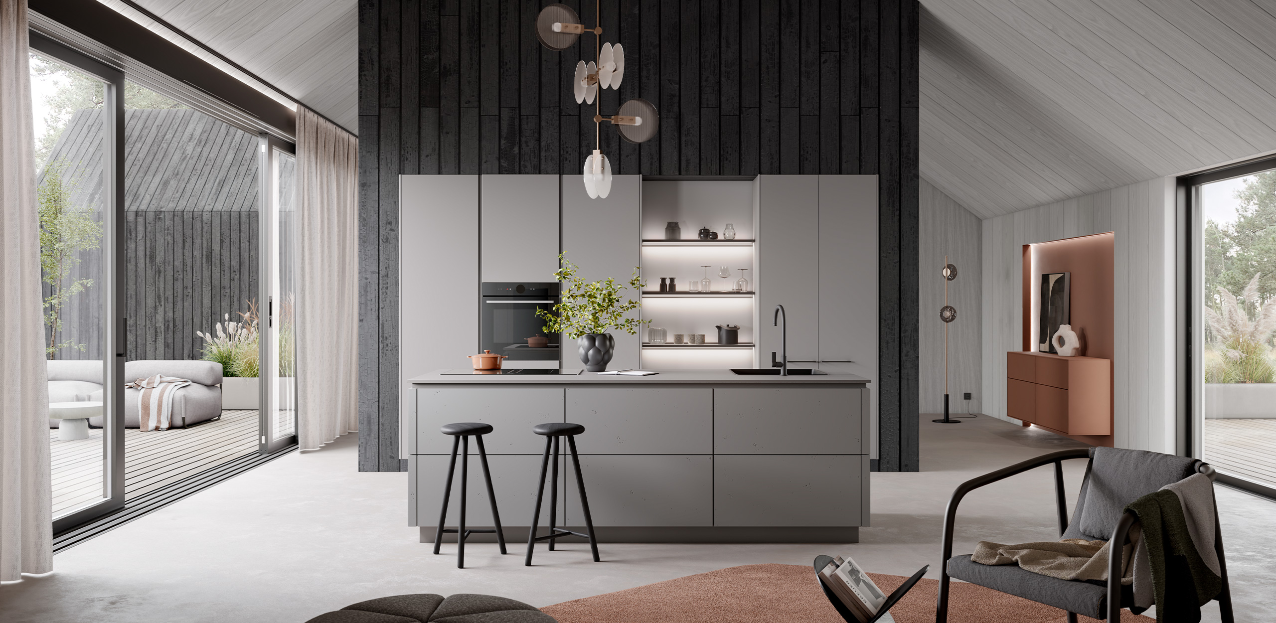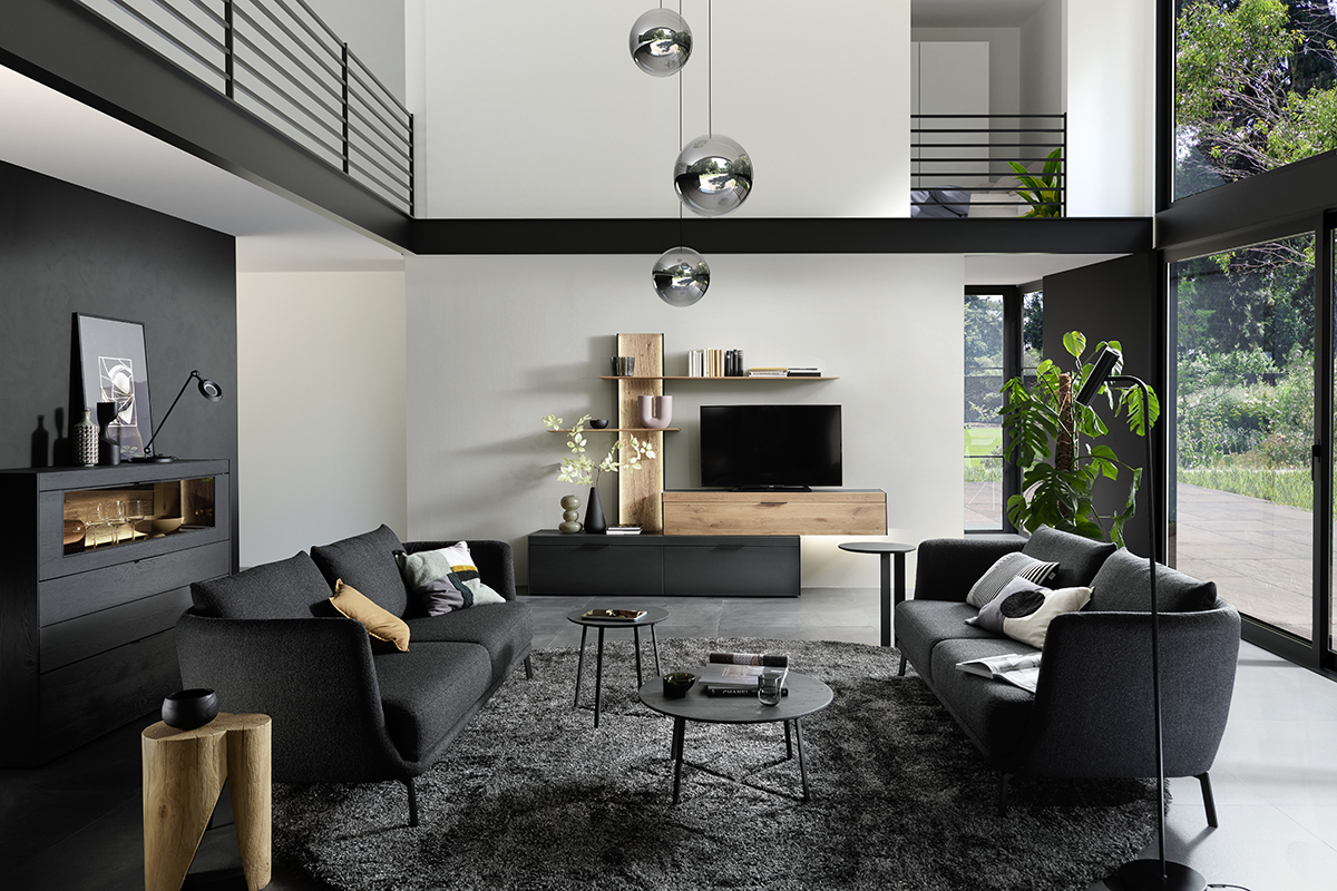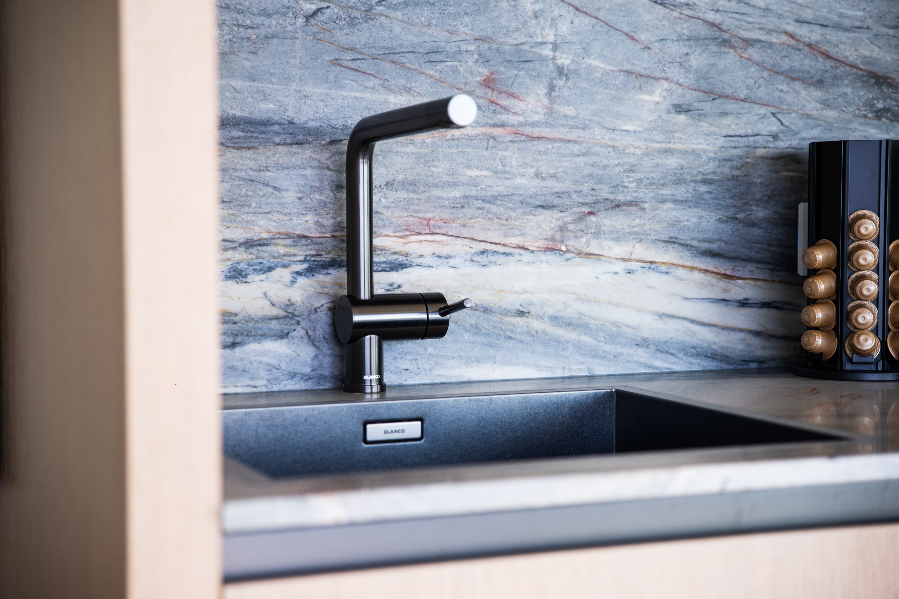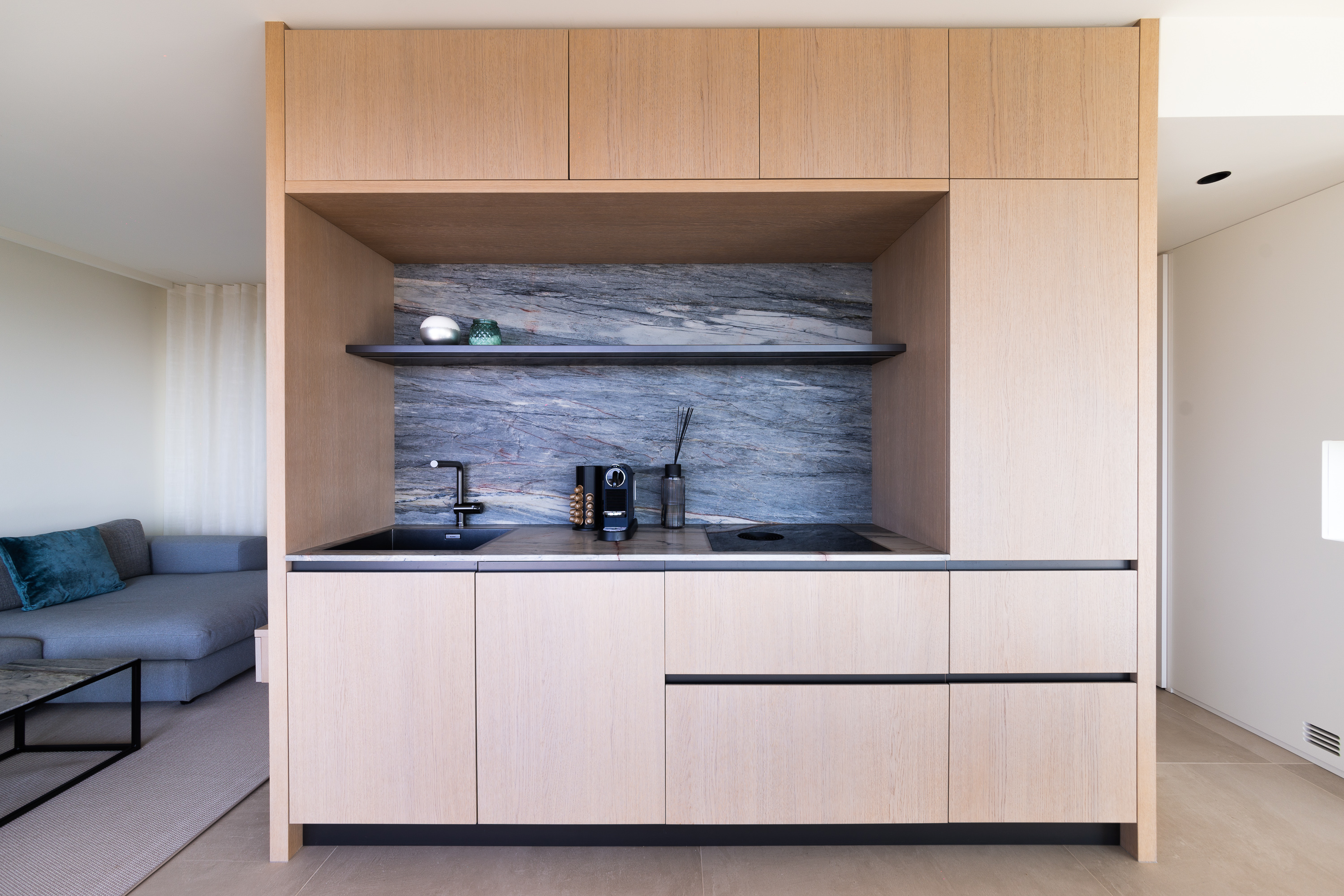 Una parete in legno su misura collega armoniosamente il soggiorno alla cucina, creando un ambiente coerente e raffinato. Materiali di alta qualità e arredi selezionati con cura caratterizzano il design sofisticato: la cucina Dibiesse si distingue per i suoi piani di lavoro in pregiata pietra, il piano a induzione Bora e il lavello Blanco.