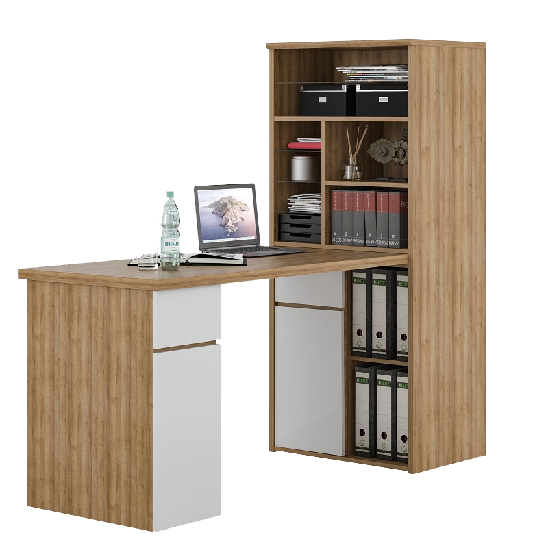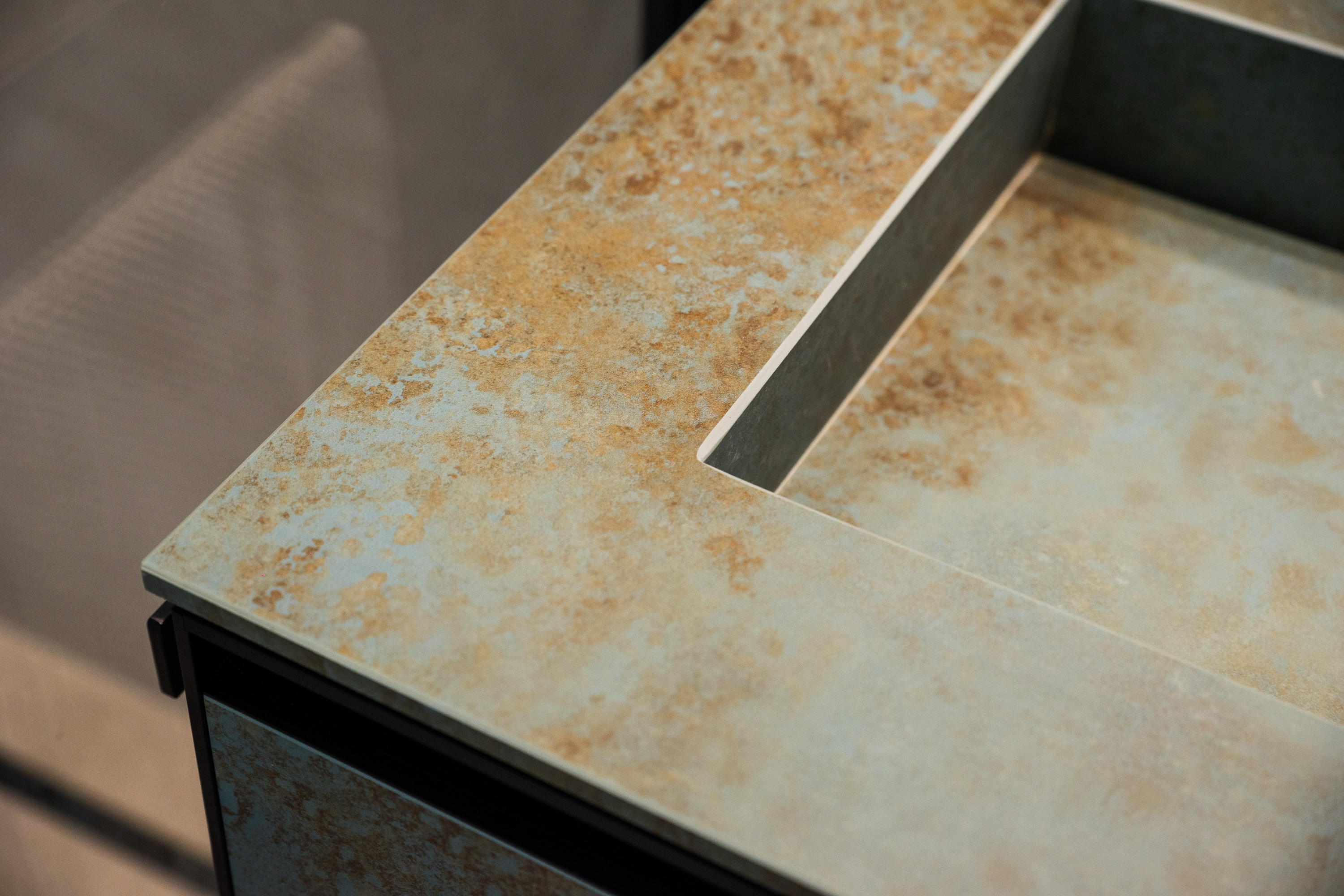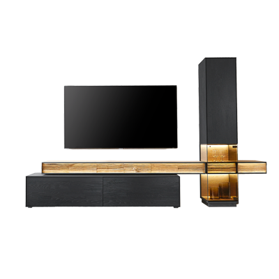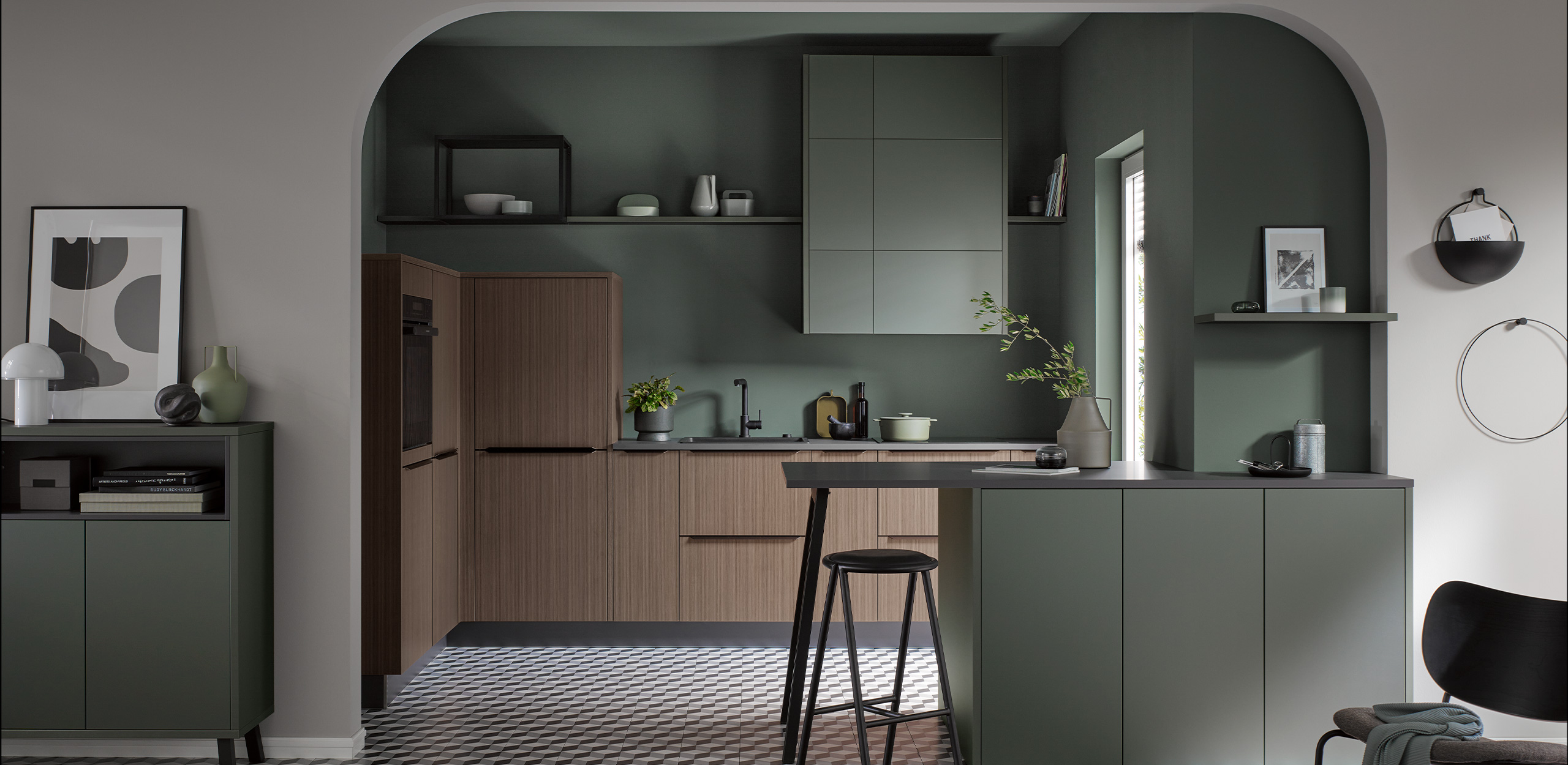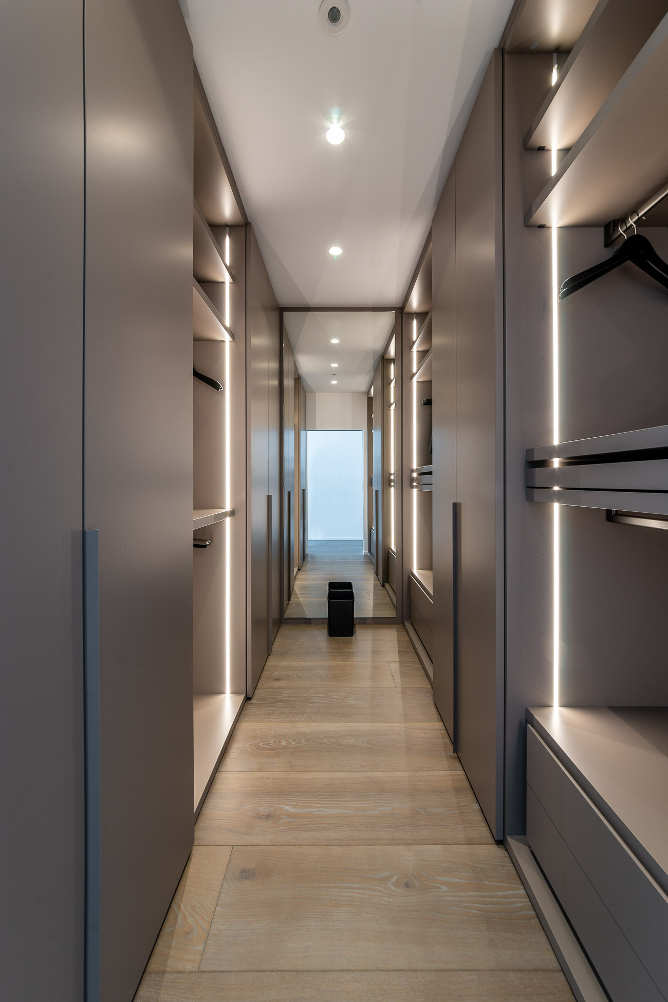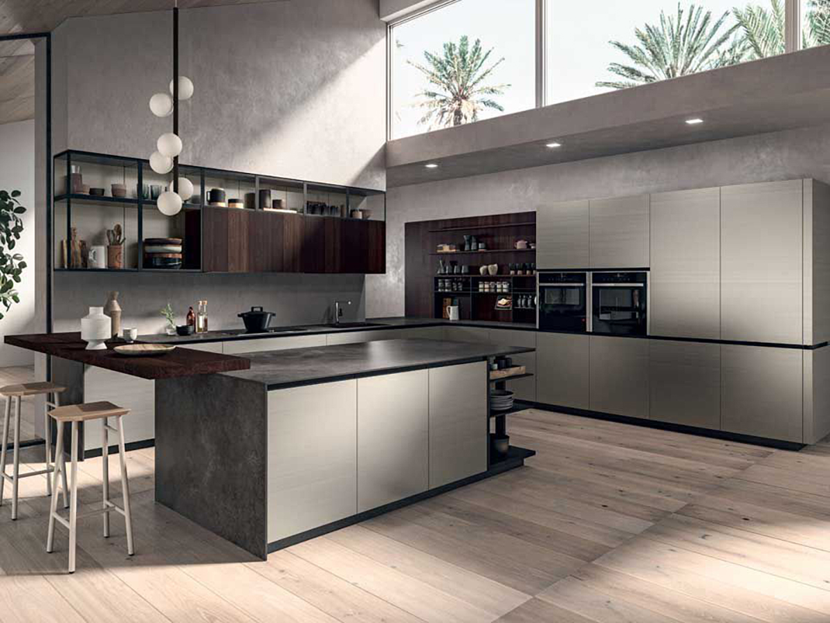 Una parete in legno su misura collega armoniosamente il soggiorno alla cucina, creando un ambiente coerente e raffinato. Materiali di alta qualità e arredi selezionati con cura caratterizzano il design sofisticato: la cucina Dibiesse si distingue per i suoi piani di lavoro in pregiata pietra, il piano a induzione Bora e il lavello Blanco.
