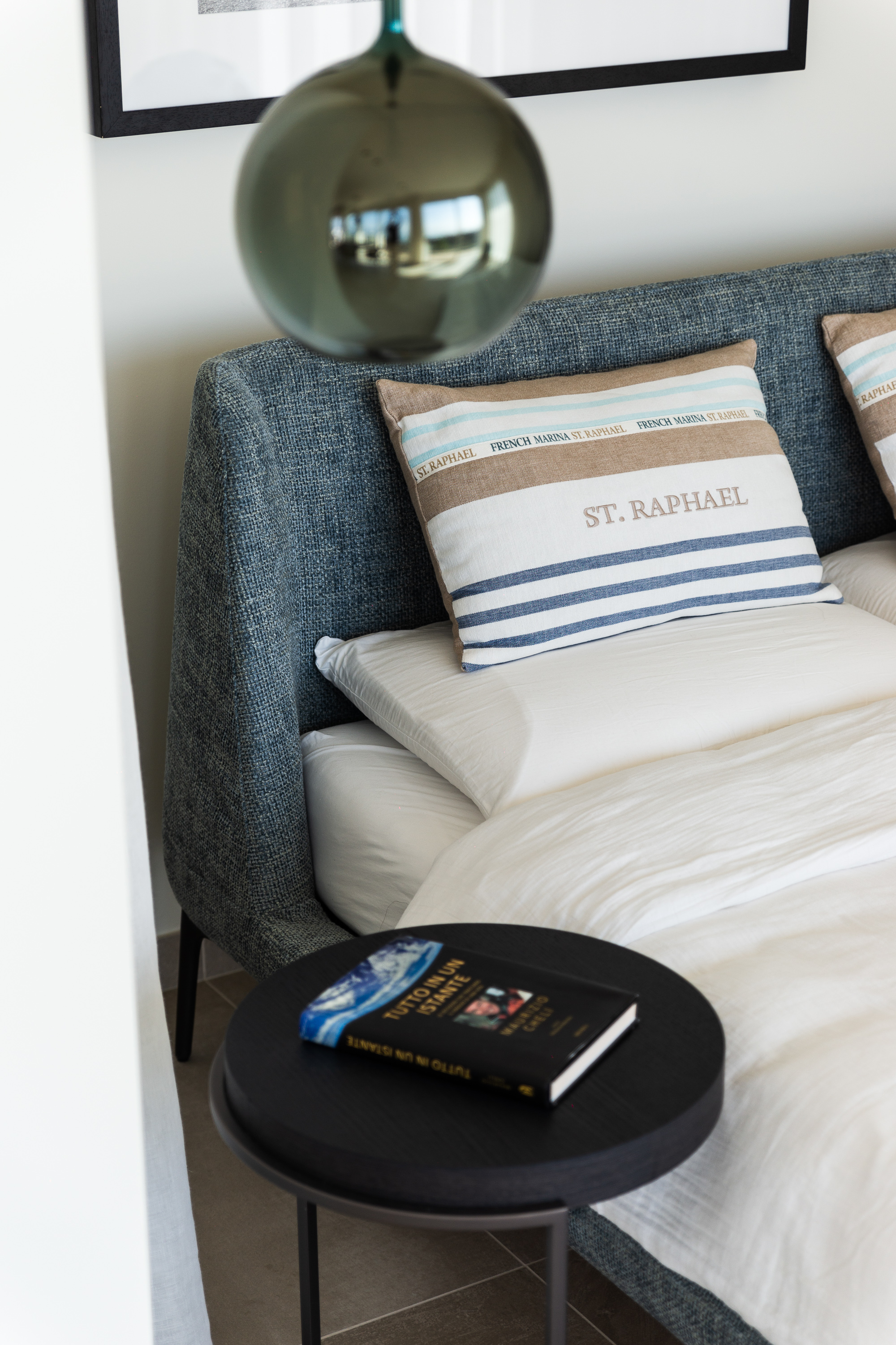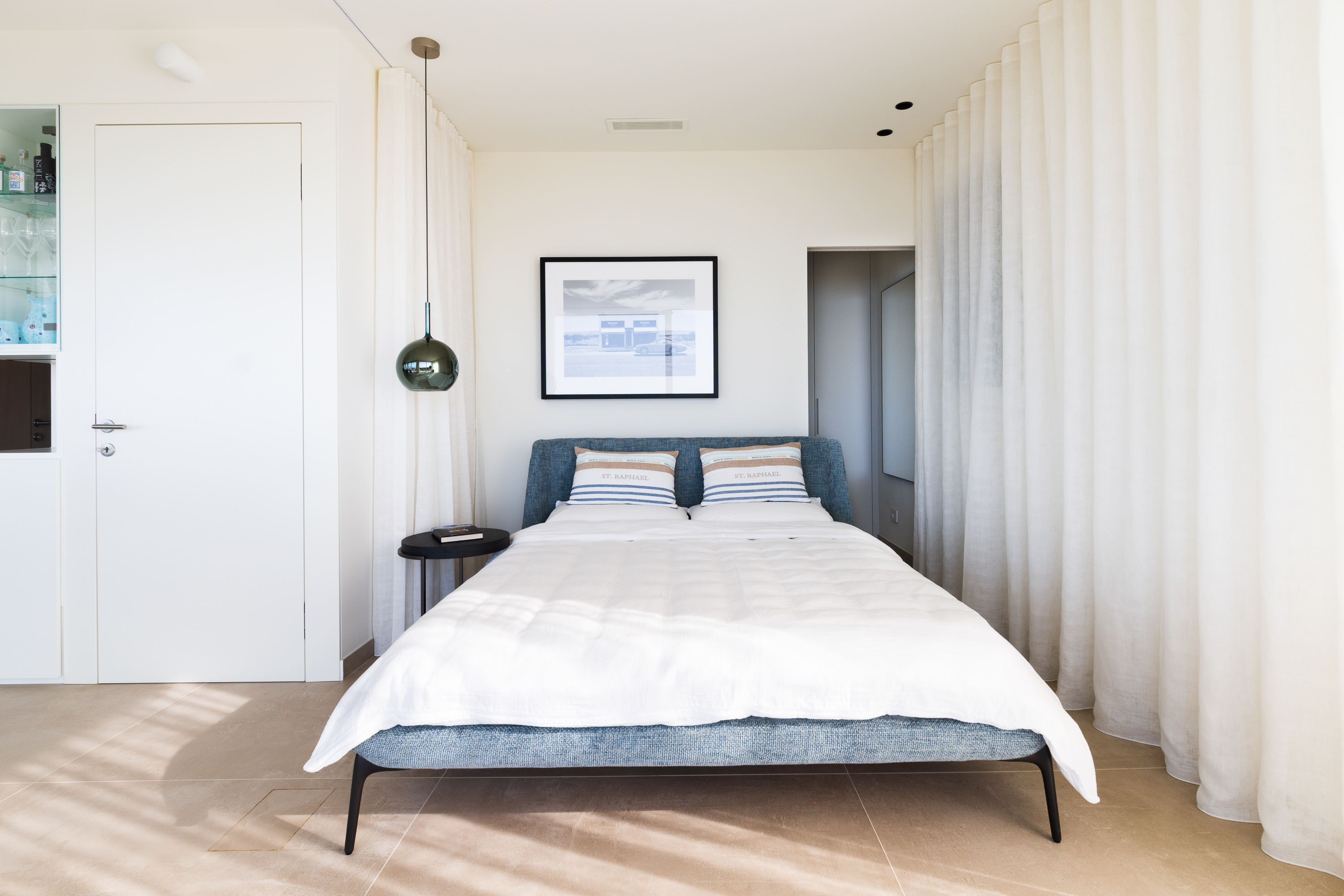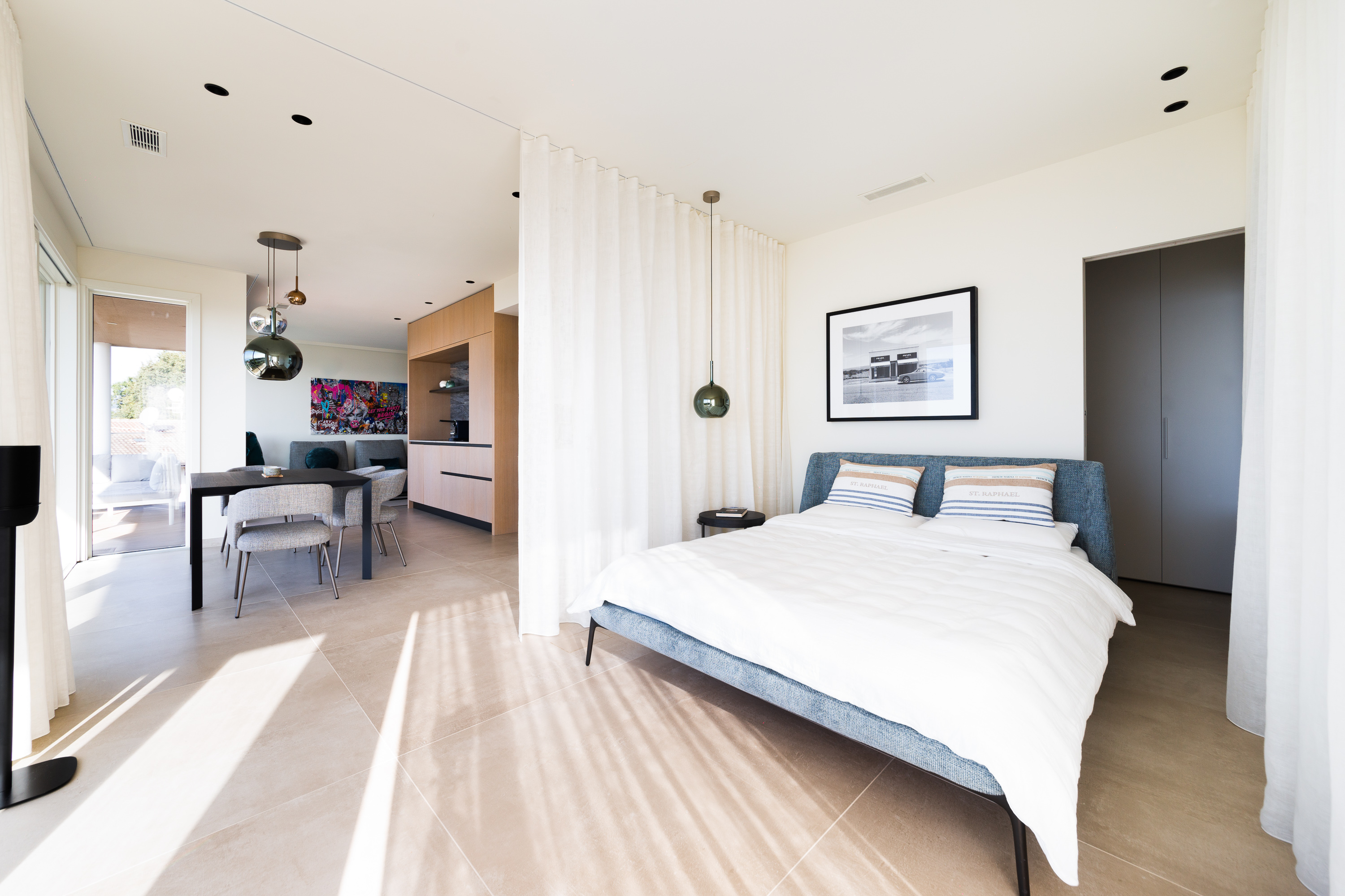 L'open space dona all’appartamento compatto un senso di leggerezza. Un elegante tendaggio separa con discrezione la zona giorno, con angolo cottura e tavolo da pranzo, dalla camera da letto.