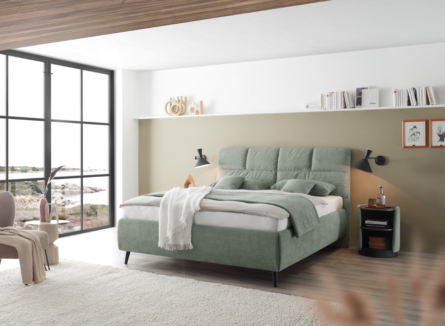Un tocco di verde pastello conferisce al modello di letto imbottito Atelier un aspetto rilassante e naturale. L'elegante tessuto avvolge il letto in una delicata armonia, mentre la struttura in legno nero crea un elegante contrasto. Il letto si integra perfettamente in qualsiasi ambiente della camera da letto e crea un accento di tendenza. Un design che non solo invita a dormire, ma anche a sognare. Lasciatevi incantare dalla qualità dei materiali e dal fascino senza tempo. Perfetto per chi apprezza stile e comfort in egual misura. Sperimentate una nuova dimensione di relax con questo letto imbottito unico.
