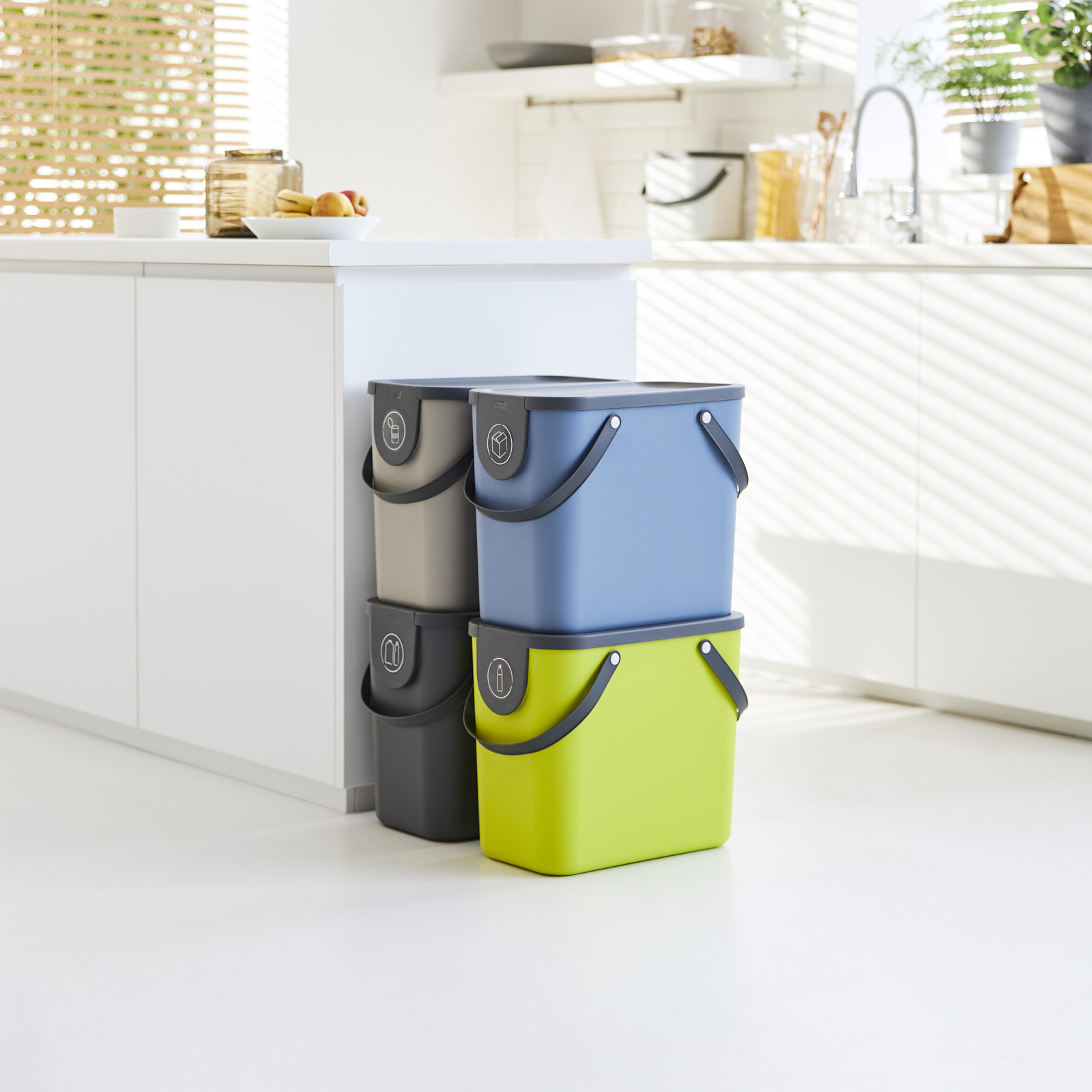 Finalmente un sistema di riciclaggio orientato al design! Con ALBULA portiamo il riciclo a un livello superiore. Grazie ai colori belli e freschi e alla forma perfettamente studiata, i bidoni possono essere utilizzati in cucina, dove si produce la maggior parte dei rifiuti. Grazie alla loro modularità e impilabilità, è possibile sovrapporre più contenitori e aprirli senza problemi grazie allo sportello anteriore. Le comode maniglie ne facilitano il trasporto, in modo che i bidoni possano essere portati direttamente alla stazione di riciclaggio. In seguito, i bidoni possono essere puliti con estrema facilità. Sei diversi adesivi sulla parte anteriore del coperchio aiutano a differenziare i rifiuti.