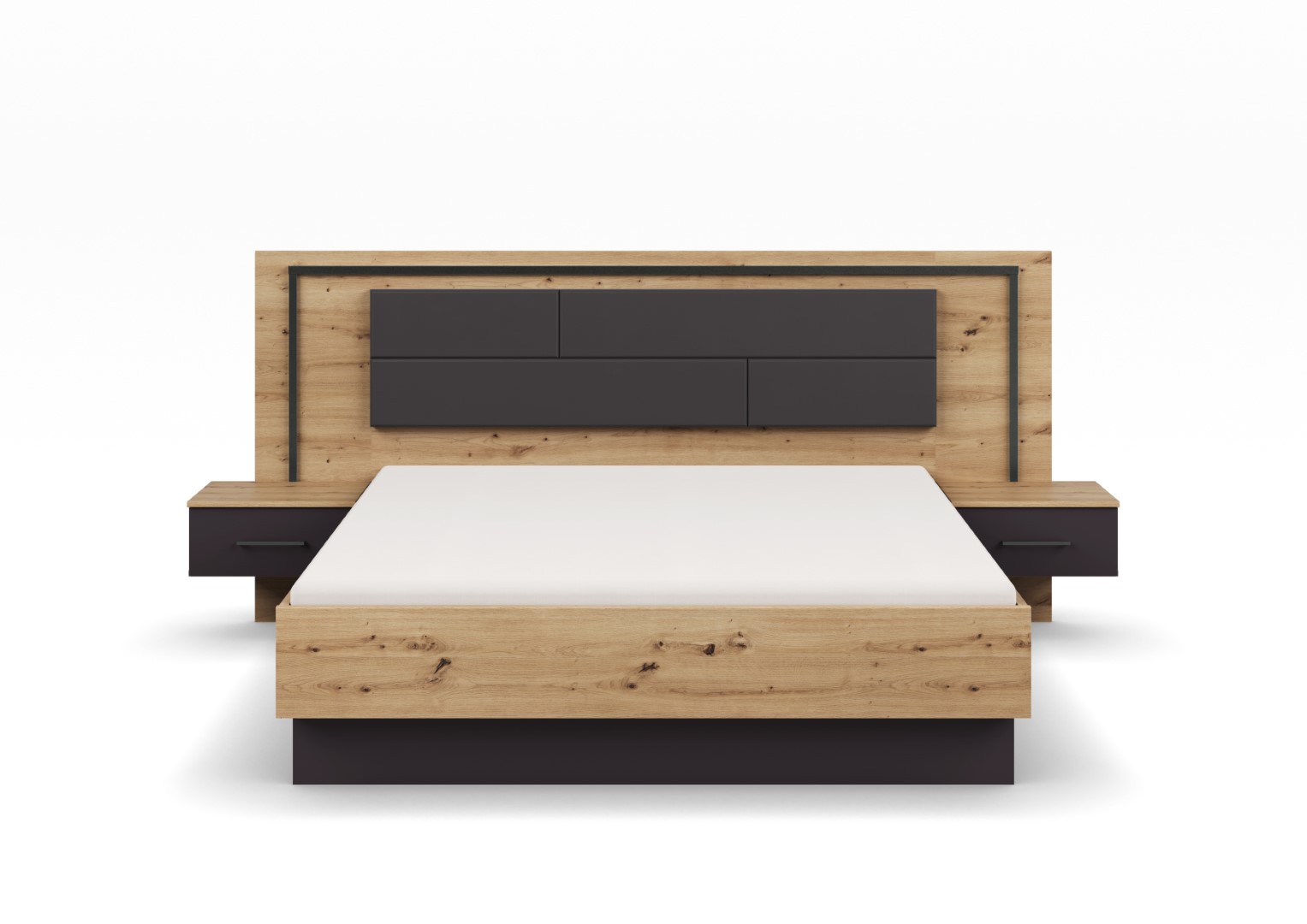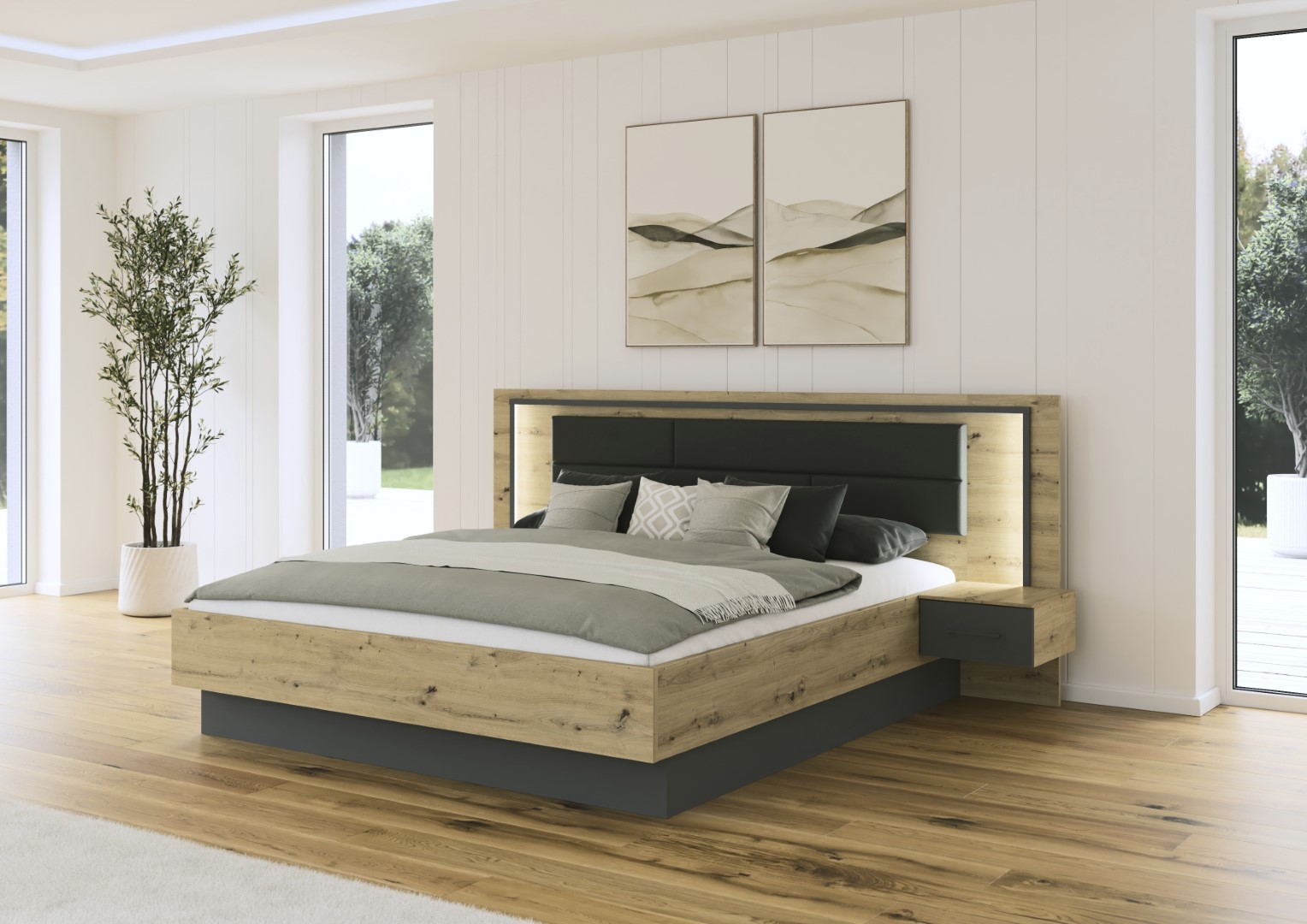 Il sistema letto Bilbao-Extra risplende in un'elegante stampa decorativa in rovere Artisan che conferisce alla vostra camera da letto un'atmosfera calda e invitante. L'armonioso mix di tonalita di quercia e grigio crea un design moderno e senza tempo che si adatta perfettamente a diversi stili di interni. Lasciatevi ispirare dalla lavorazione di alta qualita e dall'aspetto elegante, che non solo impressiona visivamente, ma fa centro anche con la funzionalita. Il sistema letto offre il comfort e l'estetica di cui avete bisogno per il vostro ambiente personale. Provate il comfort del sonno a un nuovo livello con Bilbao-Extra.