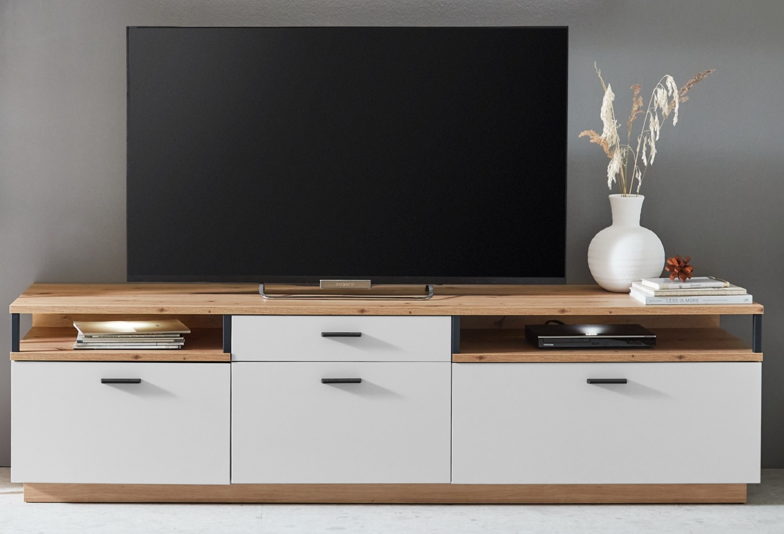Il rovere artigianale incontra il design moderno nel modello Basset. Questa imponente vetrina combina la bellezza naturale del legno con l'eleganza del vetro trasparente e della melamina. L'armoniosa palette di colori marrone e bianco, accentuata dalle tonalità del rovere, del nero e del bianco, si adatta perfettamente a qualsiasi casa. La superficie opaca conferisce al mobile una raffinatezza e un'eleganza senza tempo. Gli accenti in metallo completano l'aspetto generale e garantiscono stabilità e durata. In salotto o nella zona pranzo, questa vetrinetta non è solo un'attrazione, ma anche una soluzione pratica per esporre i vostri tesori con stile.