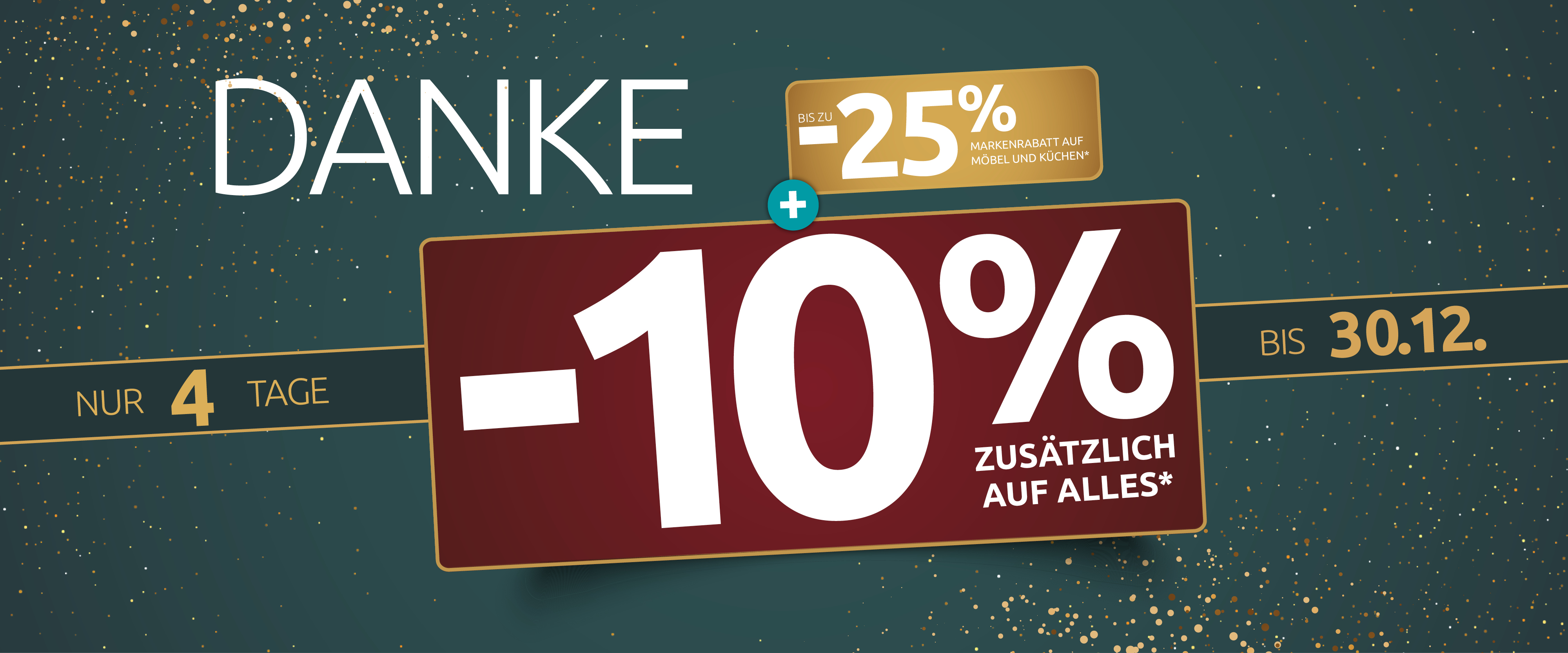 **10 % Danke-Rabatt auf Neuaufträge im Aktionszeitraum, berechnet vom bisherigen Verkaufspreis; ausgenommen sind bereits reduzierte Ware, Aktionsware, Elektrogeräte sowie die Marken Roomio und Interliving, nicht kombinierbar mit anderen Aktionen oder Rabatten.