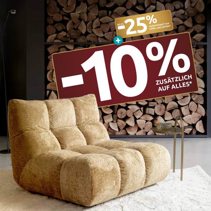 *Bis zu 25 % Markenrabatt auf viele Möbel und Küchen ausgewählter Hersteller, nur bei Neuaufträgen im Aktionszeitraum, berechnet vom Listenpreis; ausgenommen sind bereits reduzierte Ware, Aktionsware, Elektrogeräte, Accessoires, Teppiche, Lampen, Babyartikel sowie die Marken Roomio und Interliving, nicht kombinierbar mit anderen Aktionen oder Rabatten.