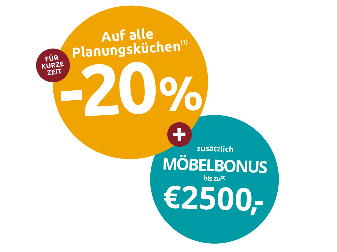 Jetzt –20% auf alle Planungsküchen sichern und mit zusätzlichem Möbelbonus bis zu 2.500€ sparen.